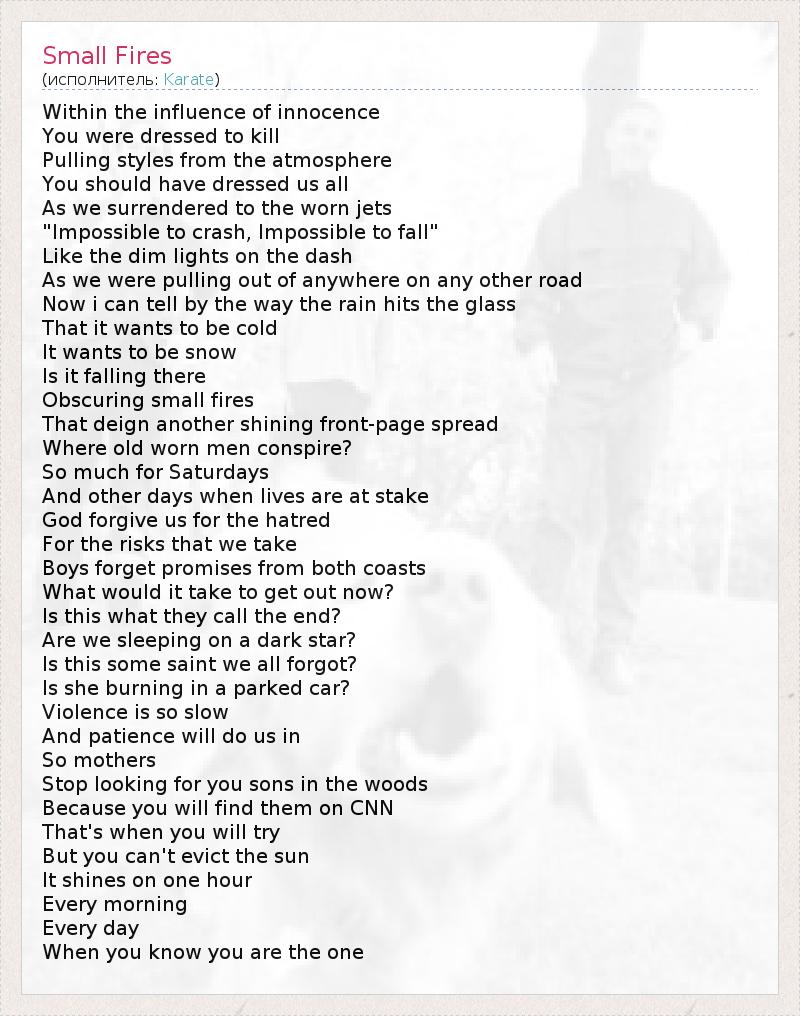 Within the influence of innocence You were dressed to kill Pulling styles from the atmosphere You should have dressed us all As we surrendered to the worn jets "Impossible to crash, Impossible to fall" Like the dim lights on the dash As we were pulling out of anywhere on any other road Now i can tell by the way the rain hits the glass That it wants to be cold It wants to be snow Is it falling there Obscuring small fires That deign another shining front-page spread Where old worn men conspire? So much for Saturdays And other days when lives are at stake God forgive us for the hatred For the risks that we take Boys forget promises from both coasts What would it take to get out now? Is this what they call the end? Are we sleeping on a dark star? Is this some saint we all forgot? Is she burning in a parked car? Violence is so slow And patience will do us in So mothers Stop looking for you sons in the woods Because you will find them on CNN That's when you will try But you can't evict the sun It shines on one hour Every morning Every day When you know you are the one