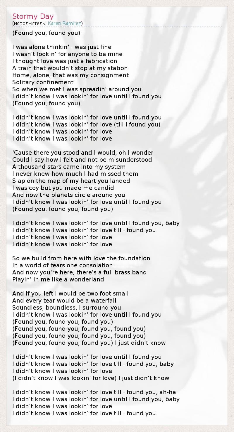 (Found you, found you) I was alone thinkin' I was just fine I wasn't lookin' for anyone to be mine I thought love was just a fabrication A train that wouldn't stop at my station Home, alone, that was my consignment Solitary confinement So when we met I was spreadin' around you I didn't know I was lookin' for love until I found you (Found you, found you) I didn't know I was lookin' for love until I found you I didn't know I was lookin' for love (till I found you) I didn't know I was lookin' for love I didn't know I was lookin' for love 'Cause there you stood and I would, oh I wonder Could I say how I felt and not be misunderstood A thousand stars came into my system I never knew how much I had missed them Slap on the map of my heart you landed I was coy but you made me candid And now the planets circle around you I didn't know I was lookin' for love until I found you (Found you, found you, found you) I didn't know I was lookin' for love until I found you, baby I didn't know I was lookin' for love till I found you I didn't know I was lookin' for love I didn't know I was lookin' for love So we build from here with love the foundation In a world of tears one consolation And now you're here, there's a full brass band Playin' in me like a wonderland And if you left I would be two foot small And every tear would be a waterfall Soundless, boundless, I surround you I didn't know I was lookin' for love until I found you (Found you, found you, found you) (Found you, found you, found you, found you) (Found you, found you, found you, found you) (Found you, found you, found you) I just didn't know I didn't know I was lookin' for love until I found you I didn't know I was lookin' for love till I found you, baby I didn't know I was lookin' for love (I didn't know I was lookin' for love) I just didn't know I didn't know I was lookin' for love till I found you, ah-ha I didn't know I was lookin' for love until I found you, baby I didn't know I was lookin' for love I didn't know I was lookin' for love till I found you