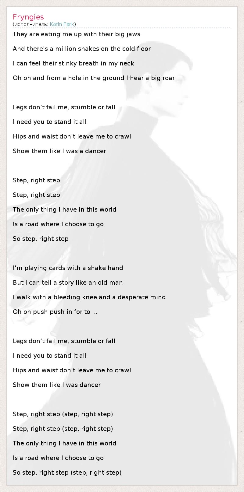 They are eating me up with their big jaws And there's a million snakes on the cold floor I can feel their stinky breath in my neck Oh oh and from a hole in the ground I hear a big roar Legs don't fail me, stumble or fall I need you to stand it all Hips and waist don't leave me to crawl Show them like I was a dancer Step, right step Step, right step The only thing I have in this world Is a road where I choose to go So step, right step I'm playing cards with a shake hand But I can tell a story like an old man I walk with a bleeding knee and a desperate mind Oh oh push push in for to ... Legs don't fail me, stumble or fall I need you to stand it all Hips and waist don't leave me to crawl Show them like I was dancer Step, right step (step, right step) Step, right step (step, right step) The only thing I have in this world Is a road where I choose to go So step, right step (step, right step)