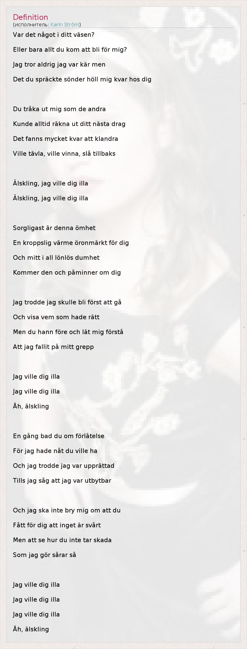 Var det något i ditt väsen? Eller bara allt du kom att bli för mig? Jag tror aldrig jag var kär men Det du spräckte sönder höll mig kvar hos dig Du tråka ut mig som de andra Kunde alltid räkna ut ditt nästa drag Det fanns mycket kvar att klandra Ville tävla, ville vinna, slå tillbaks Älskling, jag ville dig illa Älskling, jag ville dig illa Sorgligast är denna ömhet En kroppslig värme öronmärkt för dig Och mitt i all lönlös dumhet Kommer den och påminner om dig Jag trodde jag skulle bli först att gå Och visa vem som hade rätt Men du hann före och lät mig förstå Att jag fallit på mitt grepp Jag ville dig illa Jag ville dig illa Åh, älskling En gång bad du om förlåtelse För jag hade nåt du ville ha Och jag trodde jag var upprättad Tills jag såg att jag var utbytbar Och jag ska inte bry mig om att du Fått för dig att inget är svårt Men att se hur du inte tar skada Som jag gör sårar så Jag ville dig illa Jag ville dig illa Jag ville dig illa Åh, älskling