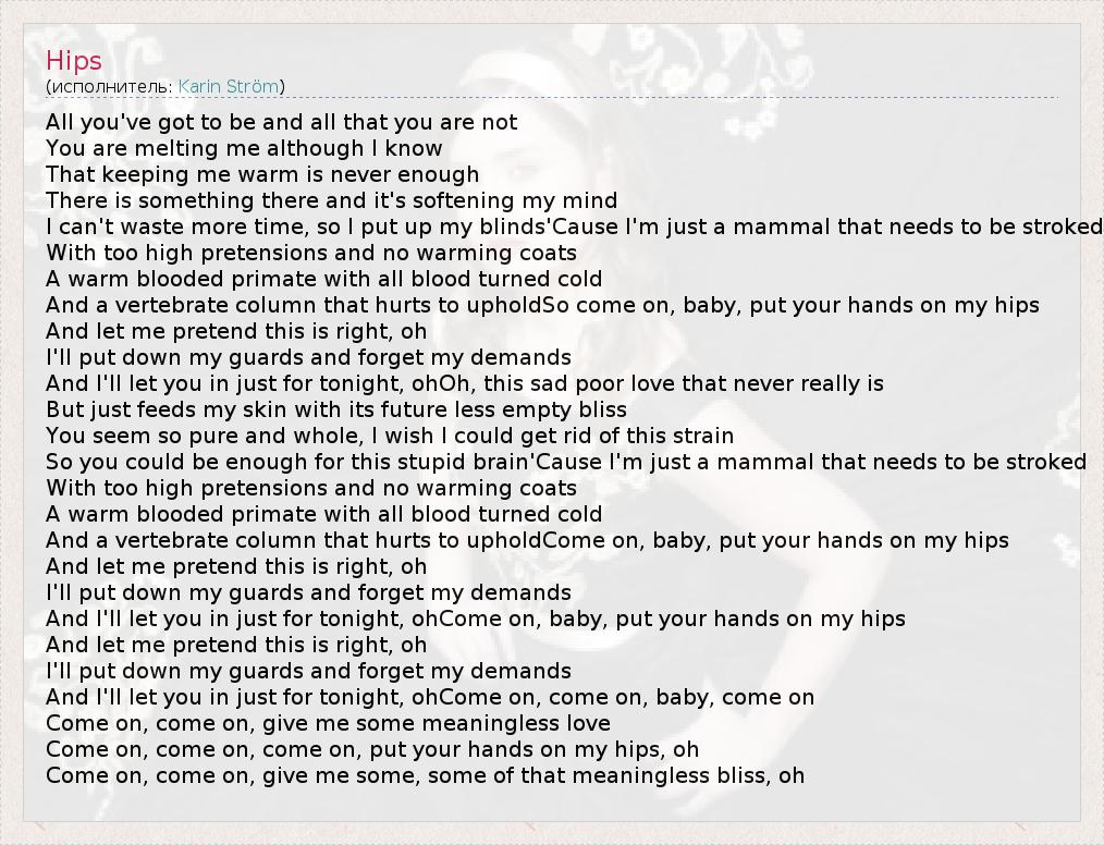 All you've got to be and all that you are not You are melting me although I know That keeping me warm is never enough There is something there and it's softening my mind I can't waste more time, so I put up my blinds'Cause I'm just a mammal that needs to be stroked With too high pretensions and no warming coats A warm blooded primate with all blood turned cold And a vertebrate column that hurts to upholdSo come on, baby, put your hands on my hips And let me pretend this is right, oh I'll put down my guards and forget my demands And I'll let you in just for tonight, ohOh, this sad poor love that never really is But just feeds my skin with its future less empty bliss You seem so pure and whole, I wish I could get rid of this strain So you could be enough for this stupid brain'Cause I'm just a mammal that needs to be stroked With too high pretensions and no warming coats A warm blooded primate with all blood turned cold And a vertebrate column that hurts to upholdCome on, baby, put your hands on my hips And let me pretend this is right, oh I'll put down my guards and forget my demands And I'll let you in just for tonight, ohCome on, baby, put your hands on my hips And let me pretend this is right, oh I'll put down my guards and forget my demands And I'll let you in just for tonight, ohCome on, come on, baby, come on Come on, come on, give me some meaningless love Come on, come on, come on, put your hands on my hips, oh Come on, come on, give me some, some of that meaningless bliss, oh