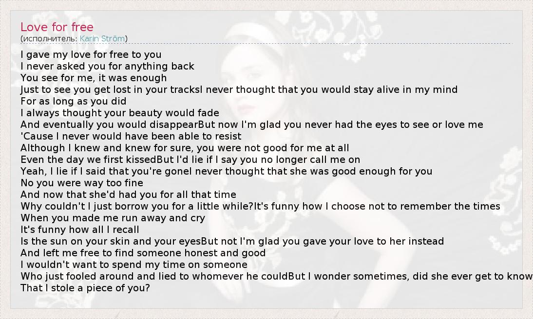 I gave my love for free to you I never asked you for anything back You see for me, it was enough Just to see you get lost in your tracksI never thought that you would stay alive in my mind For as long as you did I always thought your beauty would fade And eventually you would disappearBut now I'm glad you never had the eyes to see or love me 'Cause I never would have been able to resist Although I knew and knew for sure, you were not good for me at all Even the day we first kissedBut I'd lie if I say you no longer call me on Yeah, I lie if I said that you're goneI never thought that she was good enough for you No you were way too fine And now that she'd had you for all that time Why couldn't I just borrow you for a little while?It's funny how I choose not to remember the times When you made me run away and cry It's funny how all I recall Is the sun on your skin and your eyesBut not I'm glad you gave your love to her instead And left me free to find someone honest and good I wouldn't want to spend my time on someone Who just fooled around and lied to whomever he couldBut I wonder sometimes, did she ever get to know That I stole a piece of you?
