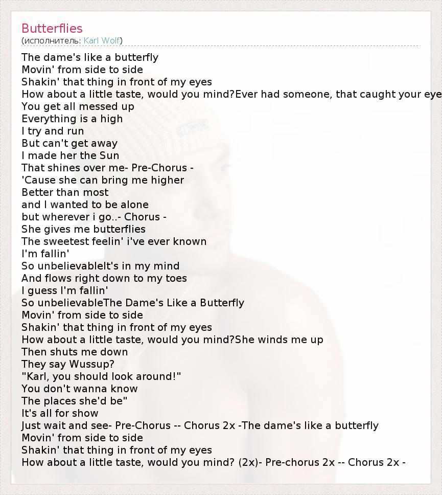 The dame's like a butterfly Movin' from side to side Shakin' that thing in front of my eyes How about a little taste, would you mind?Ever had someone, that caught your eye You get all messed up Everything is a high I try and run But can't get away I made her the Sun That shines over me- Pre-Chorus - 'Cause she can bring me higher Better than most and I wanted to be alone but wherever i go..- Chorus - She gives me butterflies The sweetest feelin' i've ever known I'm fallin' So unbelievableIt's in my mind And flows right down to my toes I guess I'm fallin' So unbelievableThe Dame's Like a Butterfly Movin' from side to side Shakin' that thing in front of my eyes How about a little taste, would you mind?She winds me up Then shuts me down They say Wussup? "Karl, you should look around!" You don't wanna know The places she'd be" It's all for show Just wait and see- Pre-Chorus -- Chorus 2x -The dame's like a butterfly Movin' from side to side Shakin' that thing in front of my eyes How about a little taste, would you mind? (2x)- Pre-chorus 2x -- Chorus 2x -