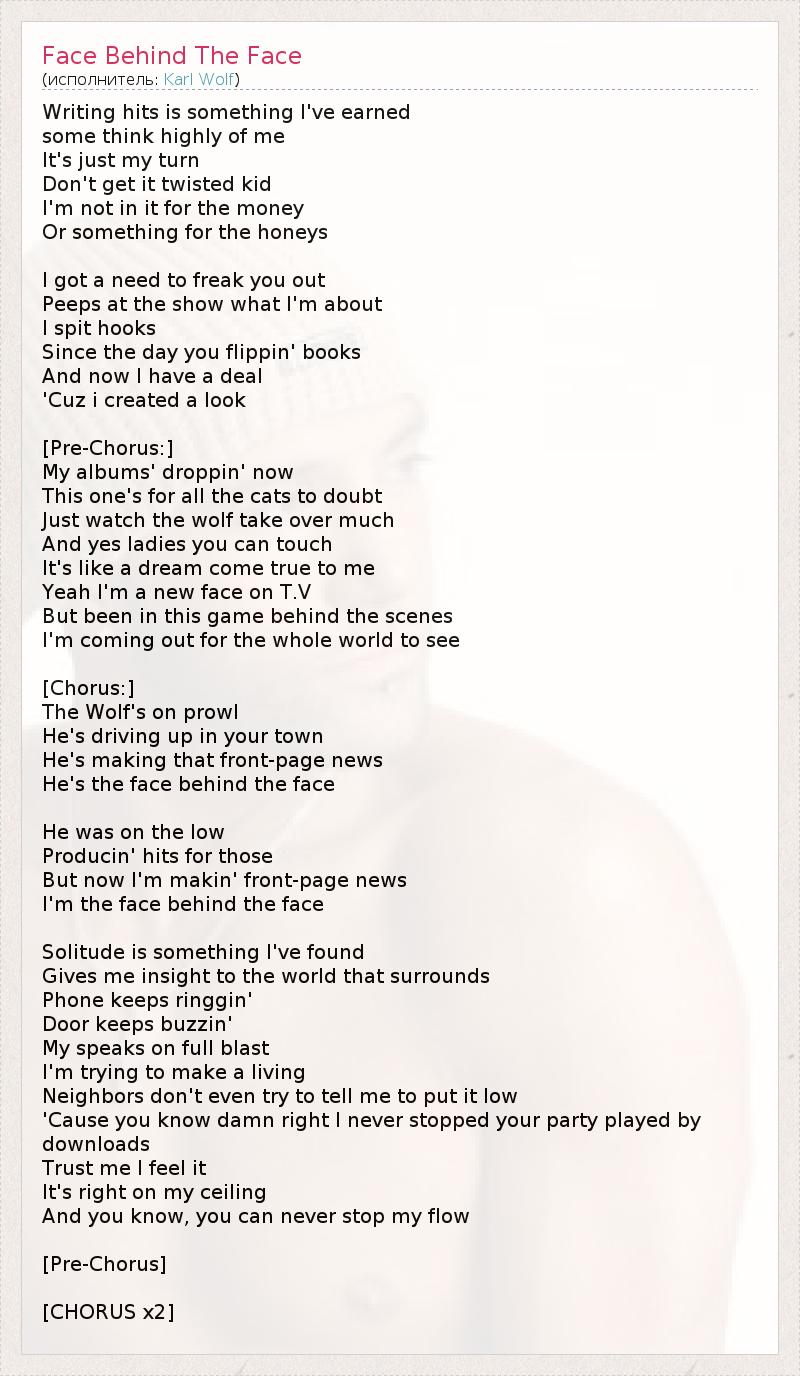 Writing hits is something I've earned some think highly of me It's just my turn Don't get it twisted kid I'm not in it for the money Or something for the honeys I got a need to freak you out Peeps at the show what I'm about I spit hooks Since the day you flippin' books And now I have a deal 'Cuz i created a look [Pre-Chorus:] My albums' droppin' now This one's for all the cats to doubt Just watch the wolf take over much And yes ladies you can touch It's like a dream come true to me Yeah I'm a new face on T.V But been in this game behind the scenes I'm coming out for the whole world to see [Chorus:] The Wolf's on prowl He's driving up in your town He's making that front-page news He's the face behind the face He was on the low Producin' hits for those But now I'm makin' front-page news I'm the face behind the face Solitude is something I've found Gives me insight to the world that surrounds Phone keeps ringgin' Door keeps buzzin' My speaks on full blast I'm trying to make a living Neighbors don't even try to tell me to put it low 'Cause you know damn right I never stopped your party played by downloads Trust me I feel it It's right on my ceiling And you know, you can never stop my flow [Pre-Chorus] [CHORUS x2]