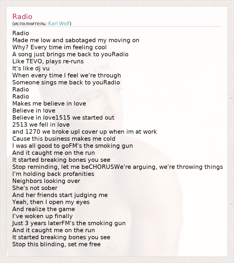 Radio Made me low and sabotaged my moving on Why? Every time im feeling cool A song just brings me back to youRadio Like TEVO, plays re-runs It's like dj vu When every time I feel we're through Someone sings me back to youRadio Radio Radio Makes me believe in love Believe in love Believe in love1515 we started out 2513 we fell in love and 1270 we broke upI cover up when im at work Cause this business makes me cold I was all good to goFM's the smoking gun And it caught me on the run It started breaking bones you see Stop reminding, let me beCHORUSWe're arguing, we're throwing things I'm holding back profanities Neighbors looking over She's not sober And her friends start judging me Yeah, then I open my eyes And realize the game I've woken up finally Just 3 years laterFM's the smoking gun And it caught me on the run It started breaking bones you see Stop this blinding, set me free