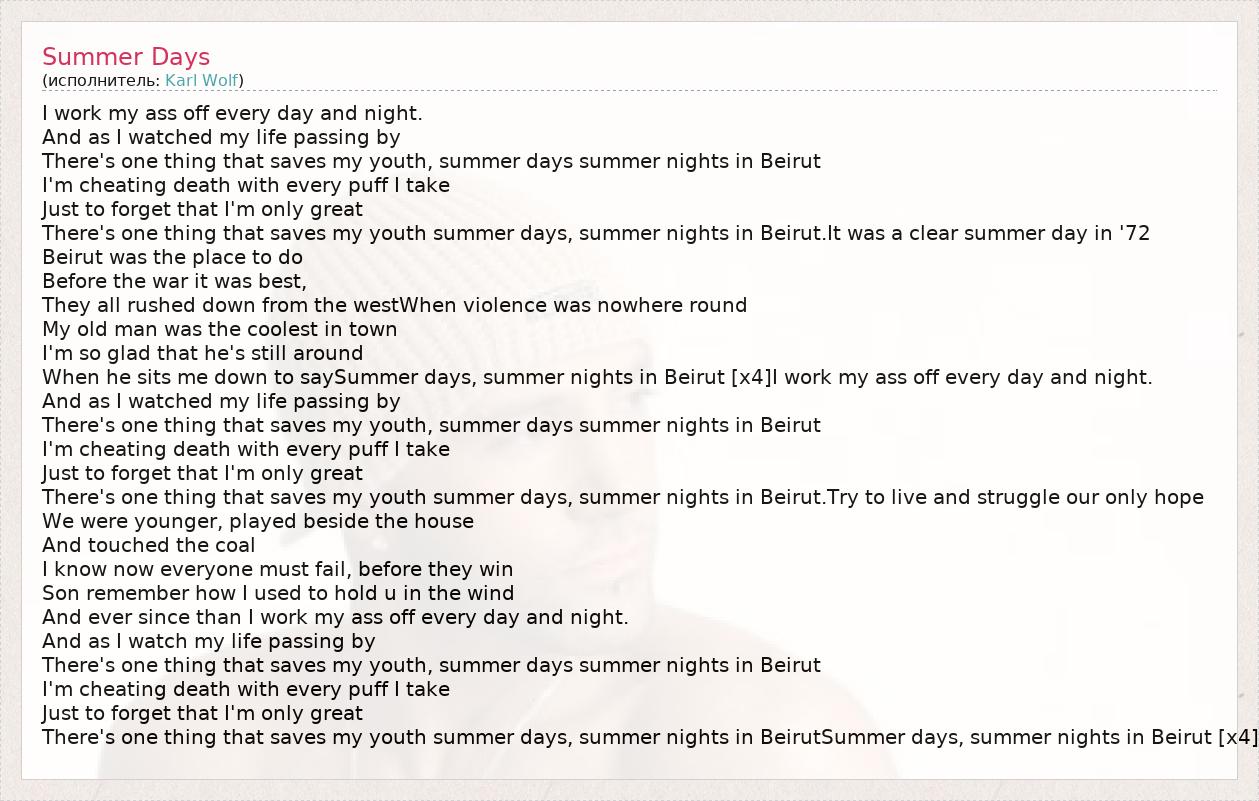 When he sits me down to saySummer days, summer nights in Beirut [x4]I work my ass off every day and night.