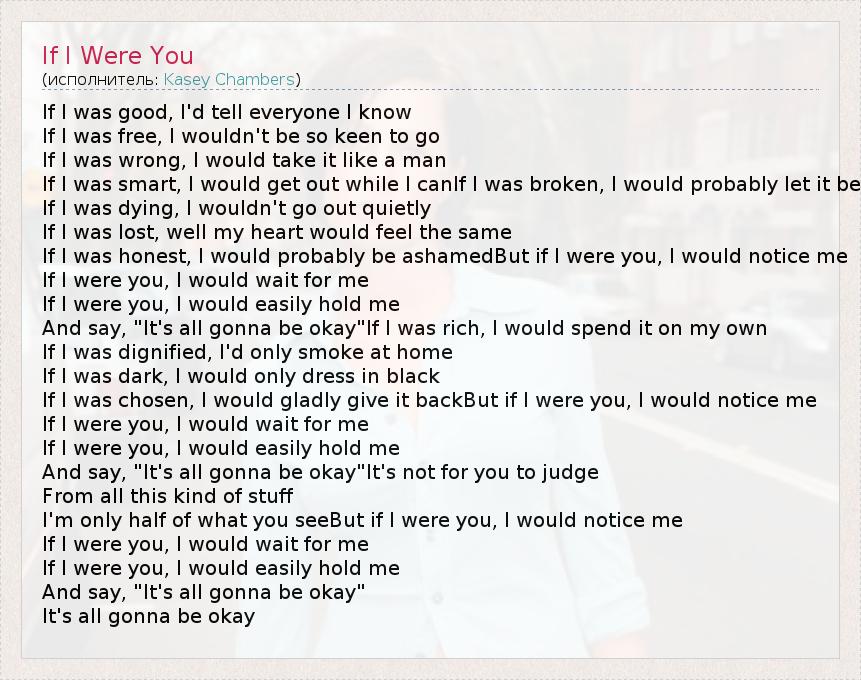 If I was good, I'd tell everyone I know If I was free, I wouldn't be so keen to go If I was wrong, I would take it like a man If I was smart, I would get out while I canIf I was broken, I would probably let it be If I was dying, I wouldn't go out quietly If I was lost, well my heart would feel the same If I was honest, I would probably be ashamedBut if I were you, I would notice me If I were you, I would wait for me If I were you, I would easily hold me And say, "It's all gonna be okay"If I was rich, I would spend it on my own If I was dignified, I'd only smoke at home If I was dark, I would only dress in black If I was chosen, I would gladly give it backBut if I were you, I would notice me If I were you, I would wait for me If I were you, I would easily hold me And say, "It's all gonna be okay"It's not for you to judge From all this kind of stuff I'm only half of what you seeBut if I were you, I would notice me If I were you, I would wait for me If I were you, I would easily hold me And say, "It's all gonna be okay" It's all gonna be okay