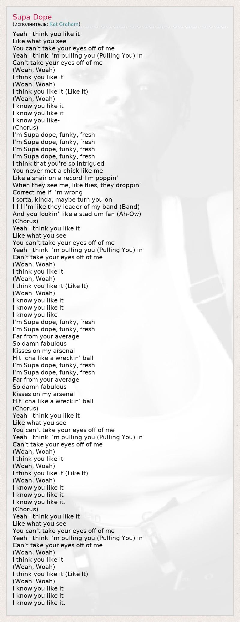 Yeah I think you like it Like what you see You can't take your eyes off of me Yeah I think I'm pulling you (Pulling You) in Can't take your eyes off of me (Woah, Woah) I think you like it (Woah, Woah) I think you like it (Like It) (Woah, Woah) I know you like it I know you like it I know you like- (Chorus) I'm Supa dope, funky, fresh I'm Supa dope, funky, fresh I'm Supa dope, funky, fresh I'm Supa dope, funky, fresh I think that you're so intrigued You never met a chick like me Like a snair on a record I'm poppin' When they see me, like flies, they droppin' Correct me if I'm wrong I sorta, kinda, maybe turn you on I-I-I I'm like they leader of my band (Band) And you lookin' like a stadium fan (Ah-Ow) (Chorus) Yeah I think you like it Like what you see You can't take your eyes off of me Yeah I think I'm pulling you (Pulling You) in Can't take your eyes off of me (Woah, Woah) I think you like it (Woah, Woah) I think you like it (Like It) (Woah, Woah) I know you like it I know you like it I know you like- I'm Supa dope, funky, fresh I'm Supa dope, funky, fresh Far from your average So damn fabulous Kisses on my arsenal Hit 'cha like a wreckin' ball I'm Supa dope, funky, fresh I'm Supa dope, funky, fresh Far from your average So damn fabulous Kisses on my arsenal Hit 'cha like a wreckin' ball (Chorus) Yeah I think you like it Like what you see You can't take your eyes off of me Yeah I think I'm pulling you (Pulling You) in Can't take your eyes off of me (Woah, Woah) I think you like it (Woah, Woah) I think you like it (Like It) (Woah, Woah) I know you like it I know you like it I know you like it. (Chorus) Yeah I think you like it Like what you see You can't take your eyes off of me Yeah I think I'm pulling you (Pulling You) in Can't take your eyes off of me (Woah, Woah) I think you like it (Woah, Woah) I think you like it (Like It) (Woah, Woah) I know you like it I know you like it I know you like it.