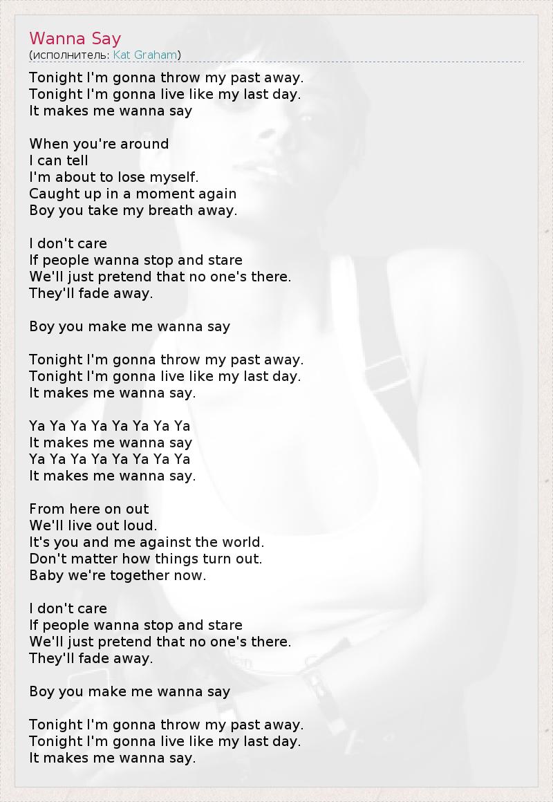 Tonight I'm gonna throw my past away. Tonight I'm gonna live like my last day. It makes me wanna say When you're around I can tell I'm about to lose myself. Caught up in a moment again Boy you take my breath away. I don't care If people wanna stop and stare We'll just pretend that no one's there. They'll fade away. Boy you make me wanna say Tonight I'm gonna throw my past away. Tonight I'm gonna live like my last day. It makes me wanna say. Ya Ya Ya Ya Ya Ya Ya Ya It makes me wanna say Ya Ya Ya Ya Ya Ya Ya Ya It makes me wanna say. From here on out We'll live out loud. It's you and me against the world. Don't matter how things turn out. Baby we're together now. I don't care If people wanna stop and stare We'll just pretend that no one's there. They'll fade away. Boy you make me wanna say Tonight I'm gonna throw my past away. Tonight I'm gonna live like my last day. It makes me wanna say.