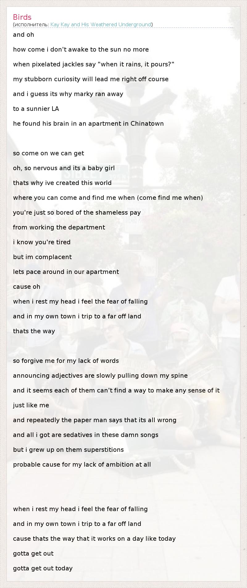 and oh how come i don't awake to the sun no more when pixelated jackles say "when it rains, it pours?" my stubborn curiosity will lead me right off course and i guess its why marky ran away to a sunnier LA he found his brain in an apartment in Chinatown so come on we can get oh, so nervous and its a baby girl thats why ive created this world where you can come and find me when (come find me when) you're just so bored of the shameless pay from working the department i know you're tired but im complacent lets pace around in our apartment cause oh when i rest my head i feel the fear of falling and in my own town i trip to a far off land thats the way so forgive me for my lack of words announcing adjectives are slowly pulling down my spine and it seems each of them can't find a way to make any sense of it just like me and repeatedly the paper man says that its all wrong and all i got are sedatives in these damn songs but i grew up on them superstitions probable cause for my lack of ambition at all when i rest my head i feel the fear of falling and in my own town i trip to a far off land cause thats the way that it works on a day like today gotta get out gotta get out today