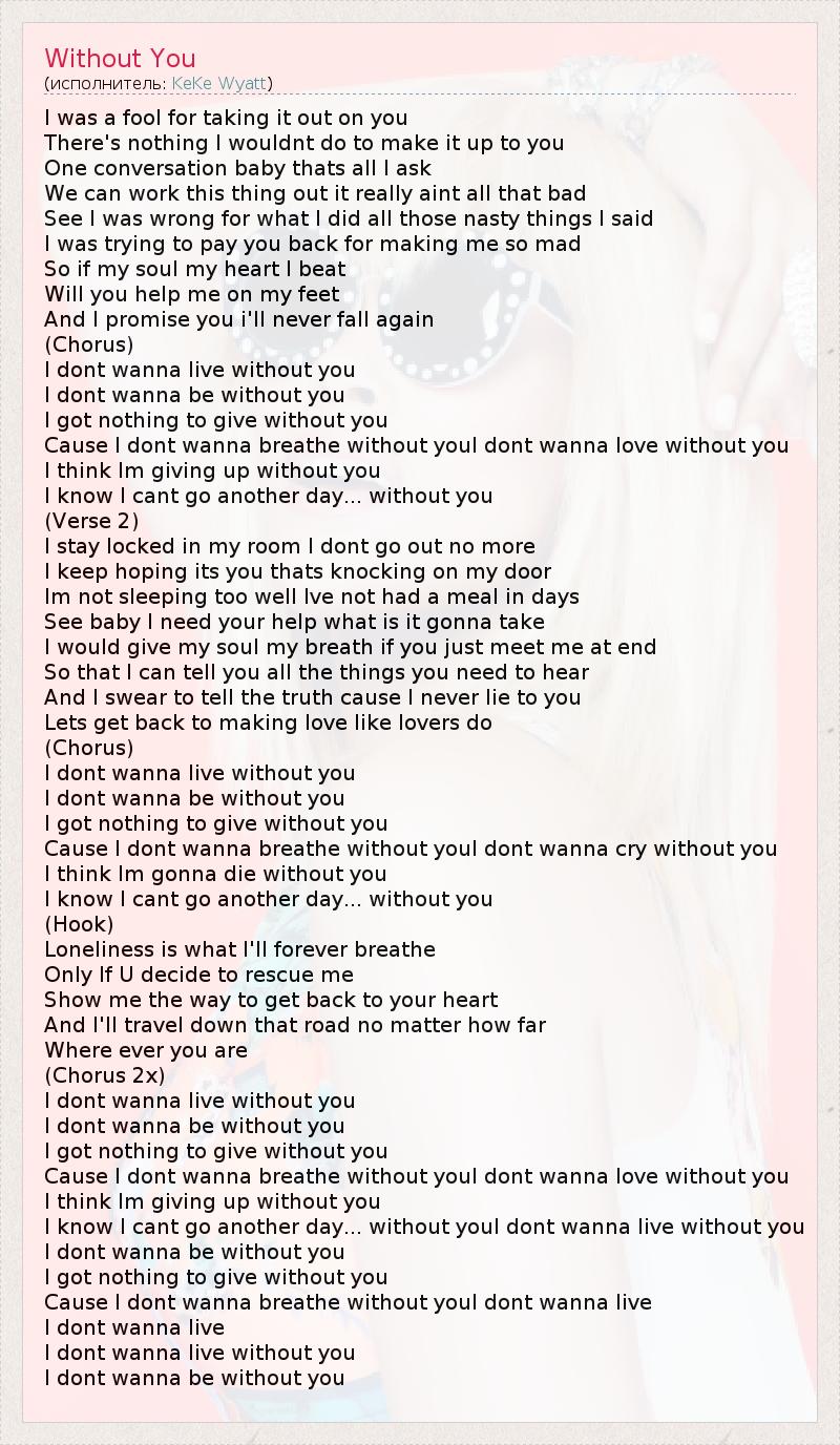 Cause I dont wanna breathe without youI dont wanna cry without you