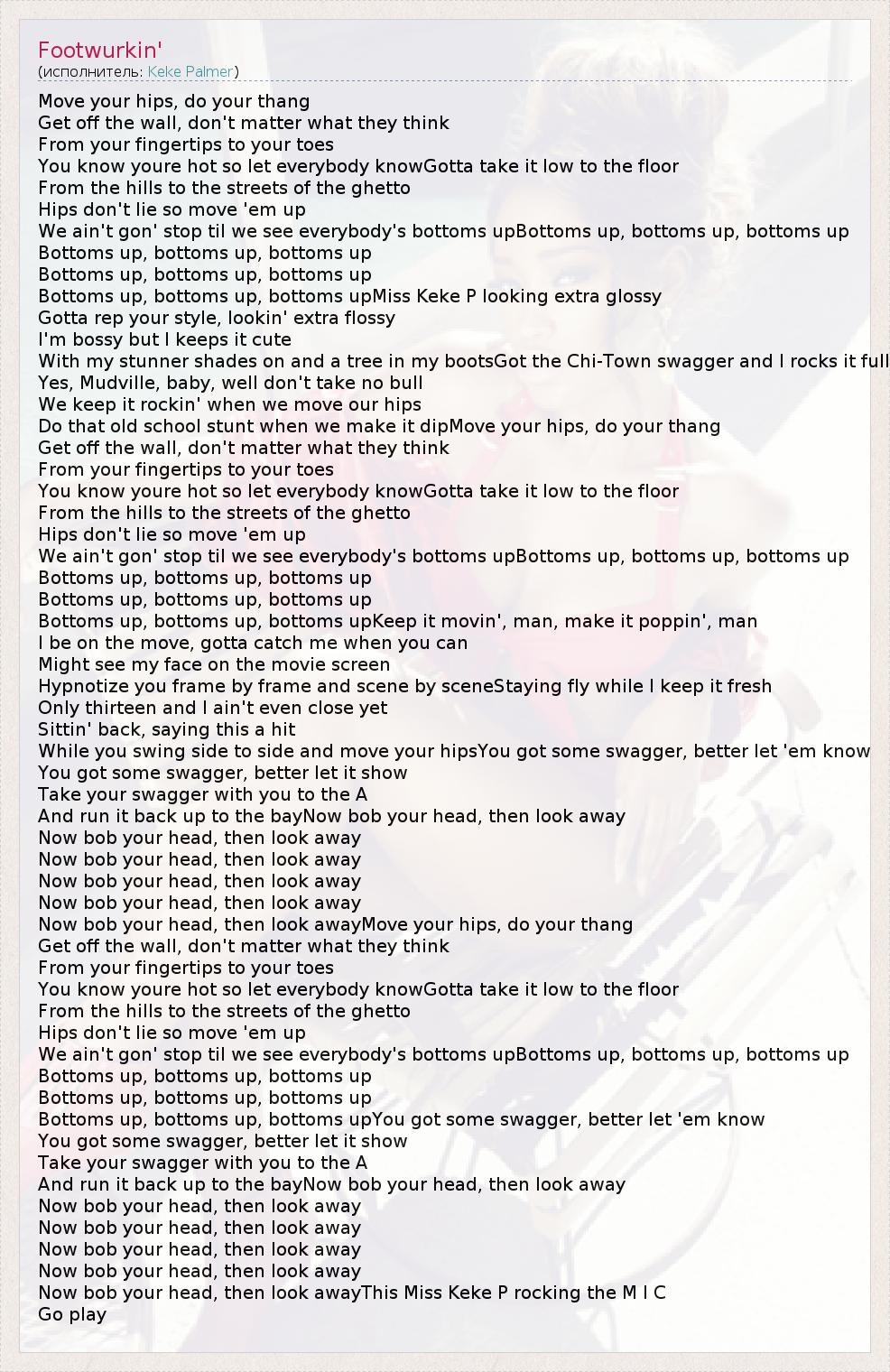 Move your hips, do your thang Get off the wall, don't matter what they think From your fingertips to your toes You know youre hot so let everybody knowGotta take it low to the floor From the hills to the streets of the ghetto Hips don't lie so move 'em up We ain't gon' stop til we see everybody's bottoms upBottoms up, bottoms up, bottoms up Bottoms up, bottoms up, bottoms up Bottoms up, bottoms up, bottoms up Bottoms up, bottoms up, bottoms upMiss Keke P looking extra glossy Gotta rep your style, lookin' extra flossy I'm bossy but I keeps it cute With my stunner shades on and a tree in my bootsGot the Chi-Town swagger and I rocks it full Yes, Mudville, baby, well don't take no bull We keep it rockin' when we move our hips Do that old school stunt when we make it dipMove your hips, do your thang Get off the wall, don't matter what they think From your fingertips to your toes You know youre hot so let everybody knowGotta take it low to the floor From the hills to the streets of the ghetto Hips don't lie so move 'em up We ain't gon' stop til we see everybody's bottoms upBottoms up, bottoms up, bottoms up Bottoms up, bottoms up, bottoms up Bottoms up, bottoms up, bottoms up Bottoms up, bottoms up, bottoms upKeep it movin', man, make it poppin', man I be on the move, gotta catch me when you can Might see my face on the movie screen Hypnotize you frame by frame and scene by sceneStaying fly while I keep it fresh Only thirteen and I ain't even close yet Sittin' back, saying this a hit While you swing side to side and move your hipsYou got some swagger, better let 'em know You got some swagger, better let it show Take your swagger with you to the A And run it back up to the bayNow bob your head, then look away Now bob your head, then look away Now bob your head, then look away Now bob your head, then look away Now bob your head, then look away Now bob your head, then look awayMove your hips, do your thang Get off the wall, don't matter what they think From your fingertips to your toes You know youre hot so let everybody knowGotta take it low to the floor From the hills to the streets of the ghetto Hips don't lie so move 'em up We ain't gon' stop til we see everybody's bottoms upBottoms up, bottoms up, bottoms up Bottoms up, bottoms up, bottoms up Bottoms up, bottoms up, bottoms up Bottoms up, bottoms up, bottoms upYou got some swagger, better let 'em know You got some swagger, better let it show Take your swagger with you to the A And run it back up to the bayNow bob your head, then look away Now bob your head, then look away Now bob your head, then look away Now bob your head, then look away Now bob your head, then look away Now bob your head, then look awayThis Miss Keke P rocking the M I C Go play
