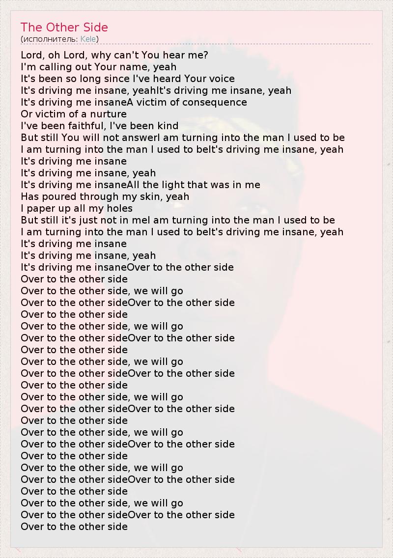 Lord, oh Lord, why can't You hear me? I'm calling out Your name, yeah It's been so long since I've heard Your voice It's driving me insane, yeahIt's driving me insane, yeah It's driving me insaneA victim of consequence Or victim of a nurture I've been faithful, I've been kind But still You will not answerI am turning into the man I used to be I am turning into the man I used to beIt's driving me insane, yeah It's driving me insane It's driving me insane, yeah It's driving me insaneAll the light that was in me Has poured through my skin, yeah I paper up all my holes But still it's just not in meI am turning into the man I used to be I am turning into the man I used to beIt's driving me insane, yeah It's driving me insane It's driving me insane, yeah It's driving me insaneOver to the other side Over to the other side Over to the other side, we will go Over to the other sideOver to the other side Over to the other side Over to the other side, we will go Over to the other sideOver to the other side Over to the other side Over to the other side, we will go Over to the other sideOver to the other side Over to the other side Over to the other side, we will go Over to the other sideOver to the other side Over to the other side Over to the other side, we will go Over to the other sideOver to the other side Over to the other side Over to the other side, we will go Over to the other sideOver to the other side Over to the other side Over to the other side, we will go Over to the other sideOver to the other side Over to the other side