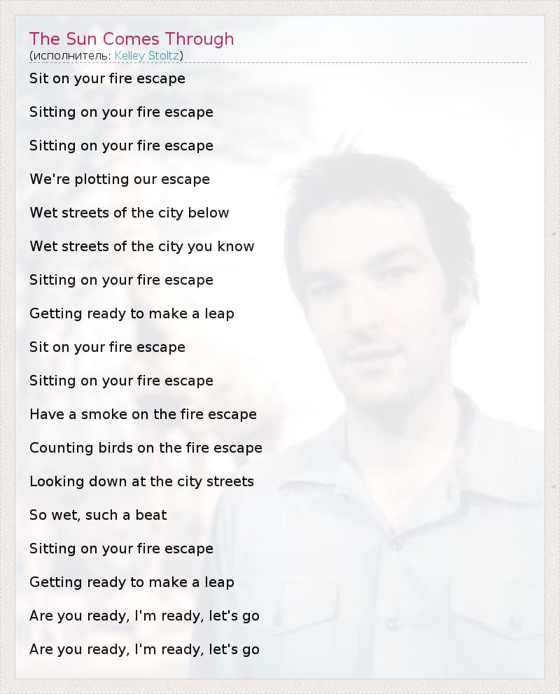 Sit on your fire escape Sitting on your fire escape Sitting on your fire escape We're plotting our escape Wet streets of the city below Wet streets of the city you know Sitting on your fire escape Getting ready to make a leap Sit on your fire escape Sitting on your fire escape Have a smoke on the fire escape Counting birds on the fire escape Looking down at the city streets So wet, such a beat Sitting on your fire escape Getting ready to make a leap Are you ready, I'm ready, let's go Are you ready, I'm ready, let's go