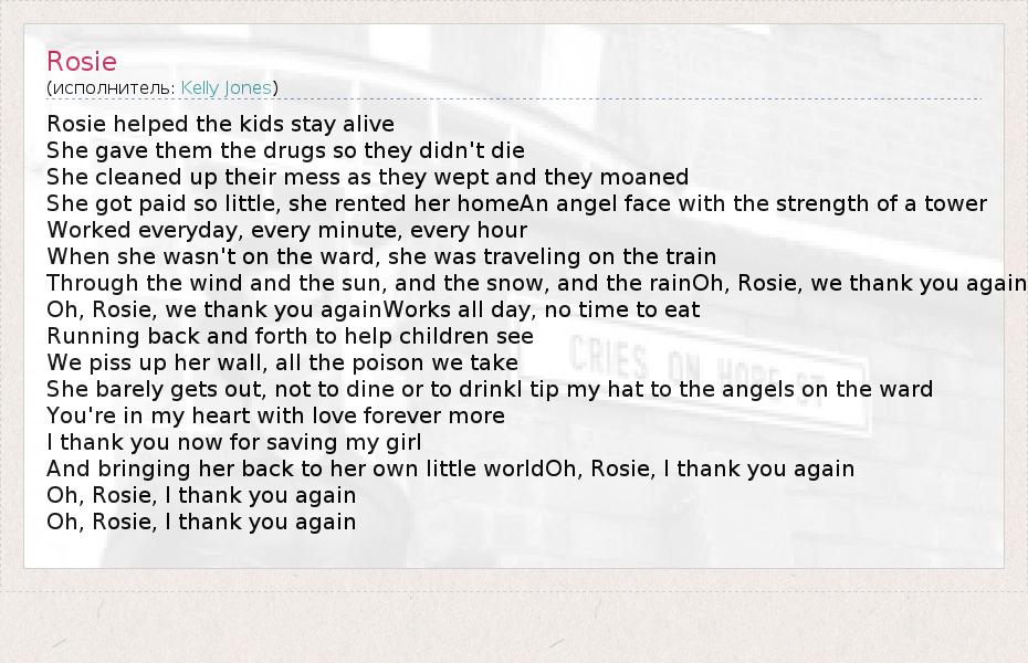 Rosie helped the kids stay alive She gave them the drugs so they didn't die She cleaned up their mess as they wept and they moaned She got paid so little, she rented her homeAn angel face with the strength of a tower Worked everyday, every minute, every hour When she wasn't on the ward, she was traveling on the train Through the wind and the sun, and the snow, and the rainOh, Rosie, we thank you again Oh, Rosie, we thank you againWorks all day, no time to eat Running back and forth to help children see We piss up her wall, all the poison we take She barely gets out, not to dine or to drinkI tip my hat to the angels on the ward You're in my heart with love forever more I thank you now for saving my girl And bringing her back to her own little worldOh, Rosie, I thank you again Oh, Rosie, I thank you again Oh, Rosie, I thank you again