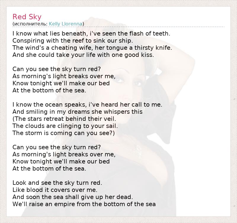 Я знаю, что сокрыто внизу, я видел блеск зубов, Сговорившихся со скалами, чтобы потопить наш корабль. Ветер – неверная жена, её язык как остриё ножа, И она может забрать твою жизнь одним прощальным поцелуем. Видишь, как небо багровеет? Когда утренний свет ударит мне в глаза, Так и знай, что наша постель этой ночью На дне моря. Я знаю, что океан говорит, я слышал ее зов, И улыбаясь в моём сне, она шепчет: (Звёзды скрылись за пеленой, Облака не отпускают твой парус, Приближается шторм, ты видишь?) Видишь, как небо багровеет? Когда утренний свет ударит мне в глаза, Так и знай, что наша постель этой ночью На дне моря. Смотри, как небо багровеет, Как кровь, оно меня окутывает. И скоро в море обнаружится её труп, Мы поднимем империю со дна моря.