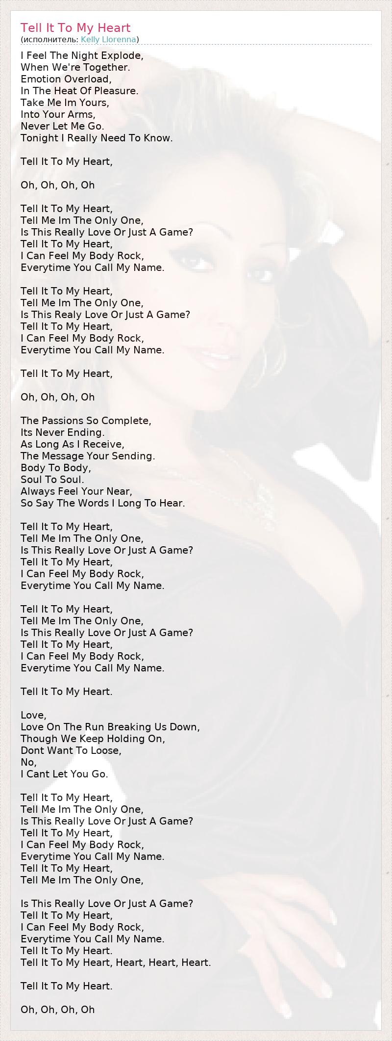 I Feel The Night Explode, When We're Together. Emotion Overload, In The Heat Of Pleasure. Take Me Im Yours, Into Your Arms, Never Let Me Go. Tonight I Really Need To Know. Tell It To My Heart, Oh, Oh, Oh, Oh Tell It To My Heart, Tell Me Im The Only One, Is This Really Love Or Just A Game? Tell It To My Heart, I Can Feel My Body Rock, Everytime You Call My Name. Tell It To My Heart, Tell Me Im The Only One, Is This Realy Love Or Just A Game? Tell It To My Heart, I Can Feel My Body Rock, Everytime You Call My Name. Tell It To My Heart, Oh, Oh, Oh, Oh The Passions So Complete, Its Never Ending. As Long As I Receive, The Message Your Sending. Body To Body, Soul To Soul. Always Feel Your Near, So Say The Words I Long To Hear. Tell It To My Heart, Tell Me Im The Only One, Is This Really Love Or Just A Game? Tell It To My Heart, I Can Feel My Body Rock, Everytime You Call My Name. Tell It To My Heart, Tell Me Im The Only One, Is This Really Love Or Just A Game? Tell It To My Heart, I Can Feel My Body Rock, Everytime You Call My Name. Tell It To My Heart. Love, Love On The Run Breaking Us Down, Though We Keep Holding On, Dont Want To Loose, No, I Cant Let You Go. Tell It To My Heart, Tell Me Im The Only One, Is This Really Love Or Just A Game? Tell It To My Heart, I Can Feel My Body Rock, Everytime You Call My Name. Tell It To My Heart, Tell Me Im The Only One, Is This Really Love Or Just A Game? Tell It To My Heart, I Can Feel My Body Rock, Everytime You Call My Name. Tell It To My Heart. Tell It To My Heart, Heart, Heart, Heart. Tell It To My Heart. Oh, Oh, Oh, Oh
