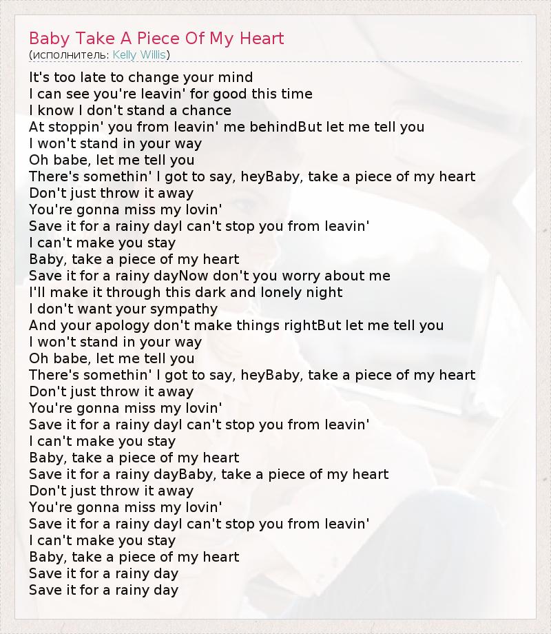 А как ты думаешь, о чем песня "Baby Take A Piece Of My Heart" ?