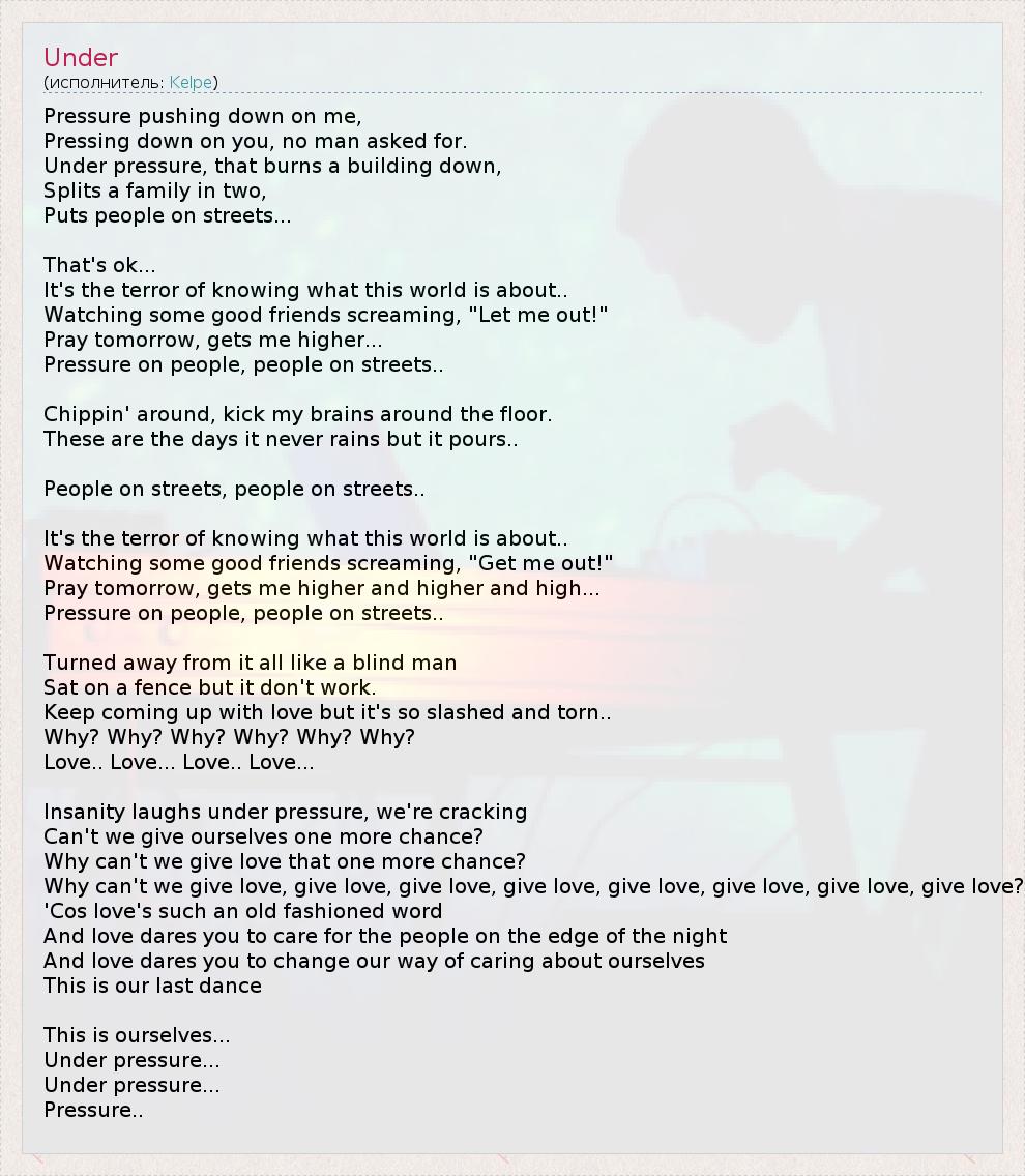Pressure pushing down on me, Pressing down on you, no man asked for. Under pressure, that burns a building down, Splits a family in two, Puts people on streets... That's ok... It's the terror of knowing what this world is about.. Watching some good friends screaming, "Let me out!" Pray tomorrow, gets me higher... Pressure on people, people on streets.. Chippin' around, kick my brains around the floor. These are the days it never rains but it pours.. People on streets, people on streets.. It's the terror of knowing what this world is about.. Watching some good friends screaming, "Get me out!" Pray tomorrow, gets me higher and higher and high... Pressure on people, people on streets.. Turned away from it all like a blind man Sat on a fence but it don't work. Keep coming up with love but it's so slashed and torn.. Why? Why? Why? Why? Why? Why? Love.. Love... Love.. Love... Insanity laughs under pressure, we're cracking Can't we give ourselves one more chance? Why can't we give love that one more chance? Why can't we give love, give love, give love, give love, give love, give love, give love, give love? 'Cos love's such an old fashioned word And love dares you to care for the people on the edge of the night And love dares you to change our way of caring about ourselves This is our last dance This is ourselves... Under pressure... Under pressure... Pressure..