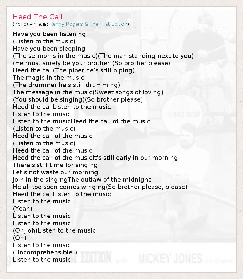 Have you been listening (Listen to the music) Have you been sleeping (The sermon's in the music)(The man standing next to you) (He must surely be your brother)(So brother please) Heed the call(The piper he's still piping) The magic in the music (The drummer he's still drumming) The message in the music(Sweet songs of loving) (You should be singing)(So brother please) Heed the callListen to the music Listen to the music Listen to the musicHeed the call of the music (Listen to the music) Heed the call of the music (Listen to the music) Heed the call of the music Heed the call of the musicIt's still early in our morning There's still time for singing Let's not waste our morning Join in the singingThe outlaw of the midnight He all too soon comes winging(So brother please, please) Heed the callListen to the music Listen to the music (Yeah) Listen to the music Listen to the music (Oh, oh)Listen to the music (Oh) Listen to the music ([Incomprehensible]) Listen to the music