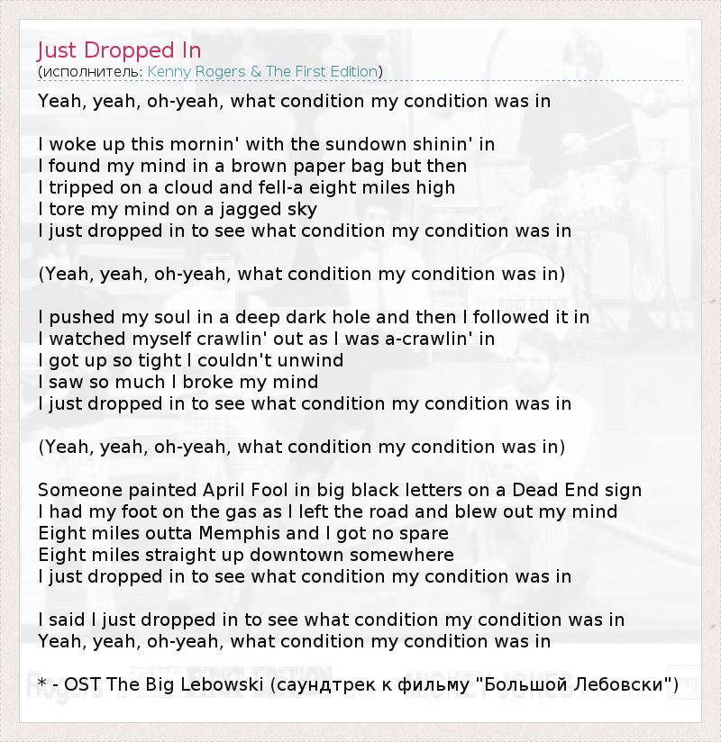 Yeah, yeah, oh-yeah, what condition my condition was in I woke up this mornin' with the sundown shinin' in I found my mind in a brown paper bag but then I tripped on a cloud and fell-a eight miles high I tore my mind on a jagged sky I just dropped in to see what condition my condition was in (Yeah, yeah, oh-yeah, what condition my condition was in) I pushed my soul in a deep dark hole and then I followed it in I watched myself crawlin' out as I was a-crawlin' in I got up so tight I couldn't unwind I saw so much I broke my mind I just dropped in to see what condition my condition was in (Yeah, yeah, oh-yeah, what condition my condition was in) Someone painted April Fool in big black letters on a Dead End sign I had my foot on the gas as I left the road and blew out my mind Eight miles outta Memphis and I got no spare Eight miles straight up downtown somewhere I just dropped in to see what condition my condition was in I said I just dropped in to see what condition my condition was in Yeah, yeah, oh-yeah, what condition my condition was in * - OST The Big Lebowski (саундтрек к фильму "Большой Лебовски")