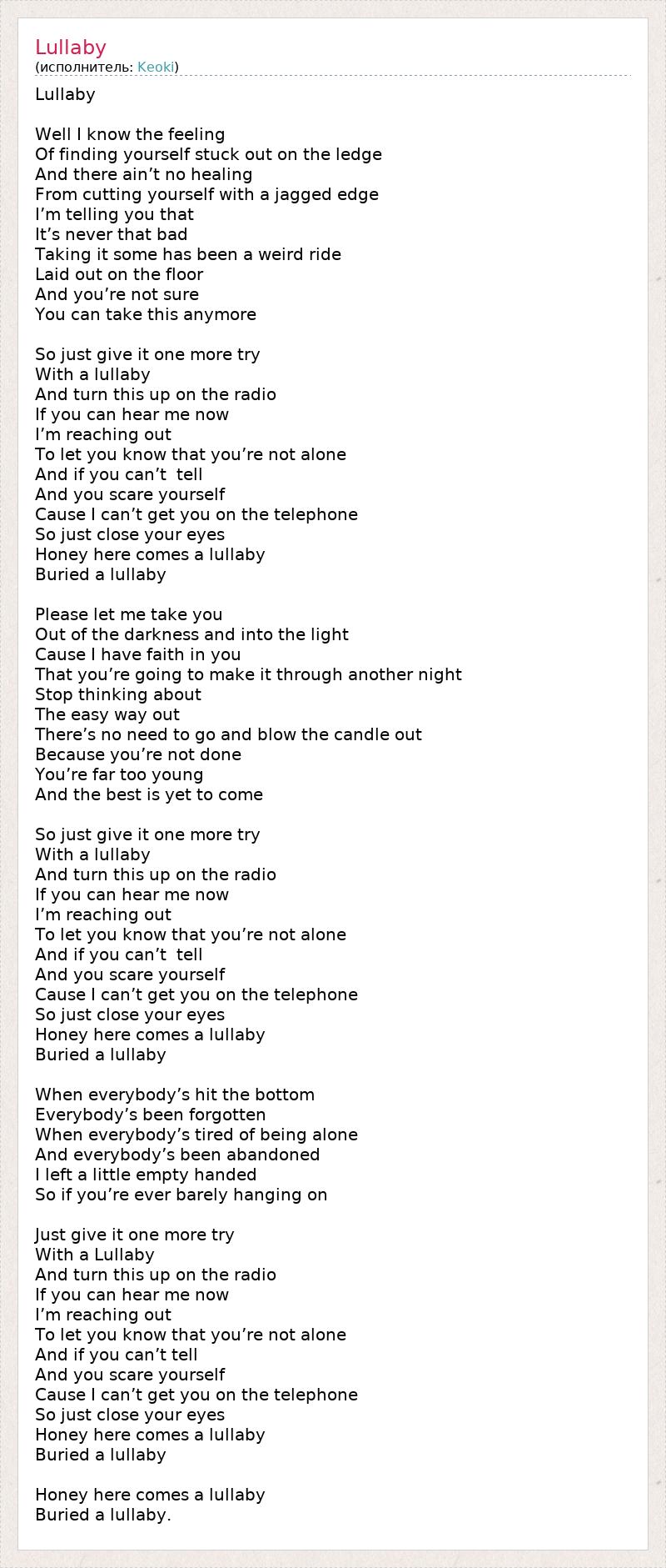 Колыбельная. Да, я знаю это ощущение, Когда ты оказываешься застрявшим на краю. И нет исцеления, От порезов об острый край. И я говорю тебе, что Это не так уж плохо, Учитывая, какой странной была гонка. Развалившись на полу, Ты не уверена, что сможешь осилить её еще раз. Просто дай ещё одну попытку, С этой колыбельной. И она окажется на радио! Если ты слышишь меня сейчас, Значит, я дотягиваюсь до тебя, Чтобы дать тебе знать, что ты не одинока. И если ты не можешь говорить, Если ты пугаешься, Потому что я не могу убедить тебя по телефону, - Просто закрой глаза. Милая, вот и колыбельная, Ты погрузилась в колыбельную. Пожалуйста, дай мне вытащить тебя из тьмы на свет. Потому что я верю в тебя, в то, что ты собираешься сделать это следующей ночью. Перестань думать о легком выходе. Нет необходимости уходить и задувать свечу Потому что ты не закончила. Ты ещё так молода И лучшее ещё впереди. Просто дай ещё одну попытку, С этой колыбельной. И она окажется на радио! Если ты слышишь меня сейчас, Значит, я дотягиваюсь до тебя, Чтобы дать тебе знать, что ты не одинока. И если ты не можешь говорить, Если ты пугаешься, Потому что я не могу убедить тебя по телефону, - Просто закрой глаза. Милая, вот и колыбельная, Ты погрузилась в колыбельную. Когда ты достигла дна, когда ты позабыта, Когда ты устала от одиночества, И когда ты покинута, Знай, я оставил немного пространства в руках, На случай, если ты когда-нибудь будешь висеть на волоске. Просто дай ещё одну попытку, С этой колыбельной. И она окажется на радио! Если ты слышишь меня сейчас, Значит, я дотягиваюсь до тебя, Чтобы дать тебе знать, что ты не одинока. И если ты не можешь говорить, Если ты пугаешься, Потому что я не могу убедить тебя по телефону, - Просто закрой глаза. Милая, вот и колыбельная, Ты погрузилась в колыбельную. Милая, вот и колыбельная, Ты погрузилась в колыбельную.