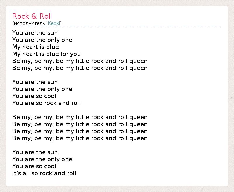 Ты - солнце, Ты - единственная, Мое сердце страдает, Мое сердце страдает по тебе. Будь моей, будь моей, будь моей маленькой королевой рок'н'ролла! Будь моей, будь моей, будь моей маленькой королевой рок'н'ролла! Ты - солнце, Ты - единственная, Ты такая клевая, Ты такая зажигательная! Будь моей, будь моей, будь моей маленькой королевой рок'н'ролла! Будь моей, будь моей, будь моей маленькой королевой рок'н'ролла! Будь моей, будь моей, будь моей маленькой королевой рок'н'ролла! Будь моей, будь моей, будь моей маленькой королевой рок'н'ролла! Ты - солнце, Ты - единственная, Ты такая клевая, Ты такая зажигательная! Будь моей, будь моей, будь моей маленькой королевой рок'н'ролла! Будь моей, будь моей, будь моей маленькой королевой рок'н'ролла! Будь моей, будь моей, будь моей маленькой королевой рок'н'ролла! Будь моей, будь моей, будь моей маленькой королевой рок'н'ролла!