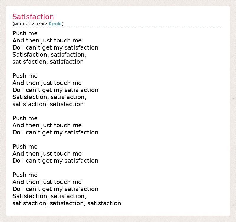 Толкни меня Затем просто дотронься до меня Я не могу получить удовлетворение Удовлетворение, удовлетворение Удовлетворение, удовлетворение Толкни меня Затем просто дотронься до меня Я не могу получить удовлетворение Удовлетворение, удовлетворение Удовлетворение, удовлетворение