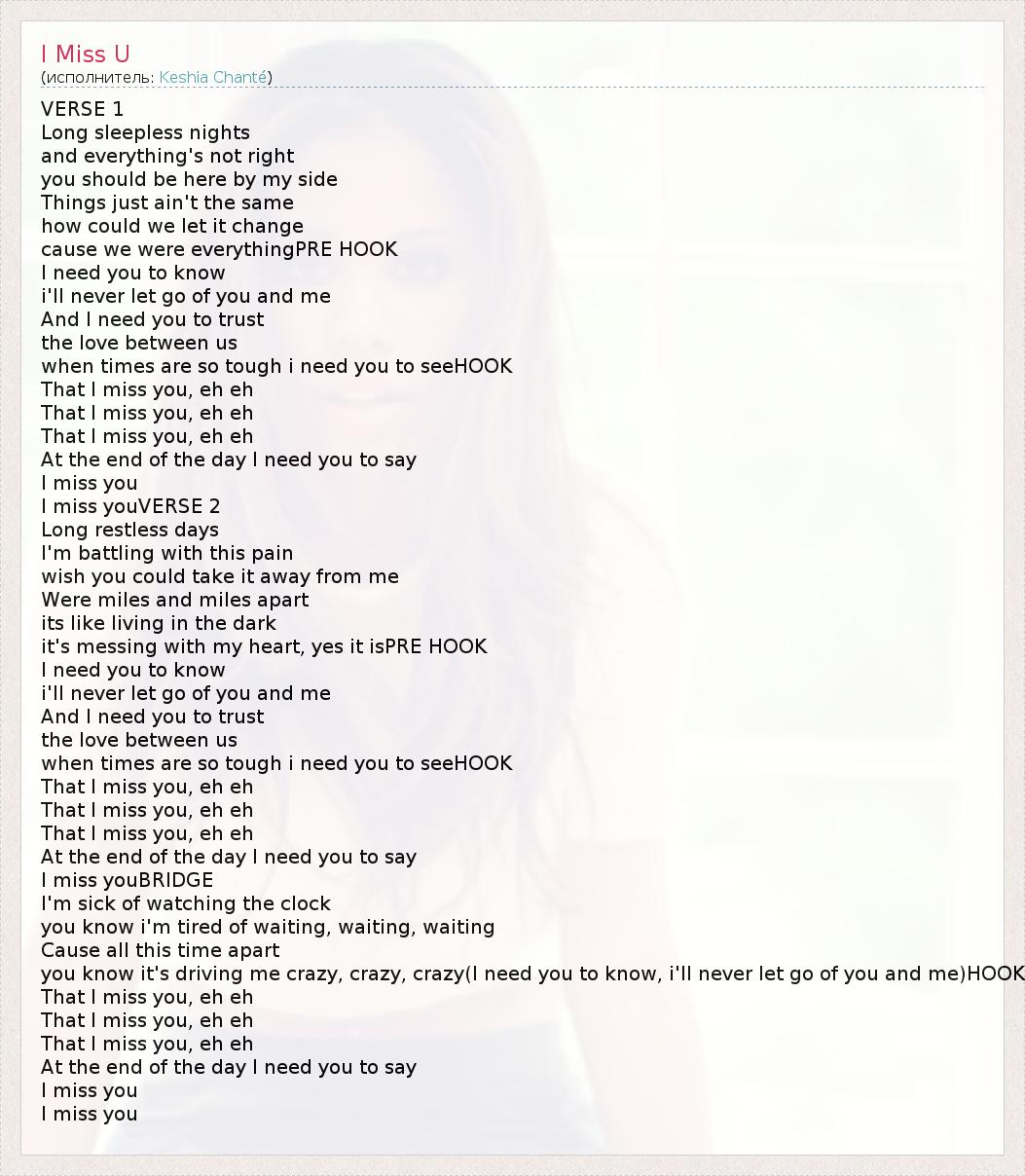 VERSE 1 Long sleepless nights and everything's not right you should be here by my side Things just ain't the same how could we let it change cause we were everythingPRE HOOK I need you to know i'll never let go of you and me And I need you to trust the love between us when times are so tough i need you to seeHOOK That I miss you, eh eh That I miss you, eh eh That I miss you, eh eh At the end of the day I need you to say I miss you I miss youVERSE 2 Long restless days I'm battling with this pain wish you could take it away from me Were miles and miles apart its like living in the dark it's messing with my heart, yes it isPRE HOOK I need you to know i'll never let go of you and me And I need you to trust the love between us when times are so tough i need you to seeHOOK That I miss you, eh eh That I miss you, eh eh That I miss you, eh eh At the end of the day I need you to say I miss youBRIDGE I'm sick of watching the clock you know i'm tired of waiting, waiting, waiting Cause all this time apart you know it's driving me crazy, crazy, crazy(I need you to know, i'll never let go of you and me)HOOK That I miss you, eh eh That I miss you, eh eh That I miss you, eh eh At the end of the day I need you to say I miss you I miss you