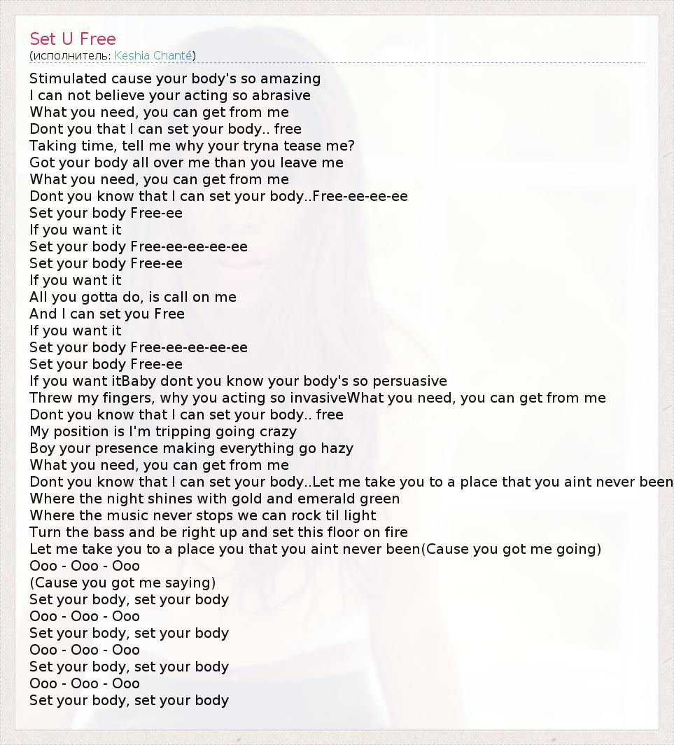 Stimulated cause your body's so amazing I can not believe your acting so abrasive What you need, you can get from me Dont you that I can set your body.. free Taking time, tell me why your tryna tease me? Got your body all over me than you leave me What you need, you can get from me Dont you know that I can set your body..Free-ee-ee-ee Set your body Free-ee If you want it Set your body Free-ee-ee-ee-ee Set your body Free-ee If you want it All you gotta do, is call on me And I can set you Free If you want it Set your body Free-ee-ee-ee-ee Set your body Free-ee If you want itBaby dont you know your body's so persuasive Threw my fingers, why you acting so invasiveWhat you need, you can get from me Dont you know that I can set your body.. free My position is I'm tripping going crazy Boy your presence making everything go hazy What you need, you can get from me Dont you know that I can set your body..Let me take you to a place that you aint never been Where the night shines with gold and emerald green Where the music never stops we can rock til light Turn the bass and be right up and set this floor on fire Let me take you to a place you that you aint never been(Cause you got me going) Ooo - Ooo - Ooo (Cause you got me saying) Set your body, set your body Ooo - Ooo - Ooo Set your body, set your body Ooo - Ooo - Ooo Set your body, set your body Ooo - Ooo - Ooo Set your body, set your body