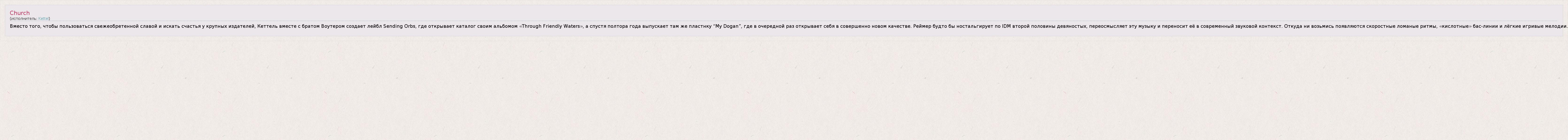 Это интересно:Реймер Эйсинг, он же Kettel – фигура, фактически связывающая старую школу IDM с новой. Старту карьеры Реймера во многом поспособствовали два «живых классика» британской электроники. Сначала Майк Парадинас aka u-Ziq приютил молодого голландца на свой лейбл Planet Mu, выпустив его дебютную семидюймовку «Atomic Tadley», а чуть позже в поклонники Кеттеля записался Ли Норрис (Metamatics), который немедленно подписал... продолжение