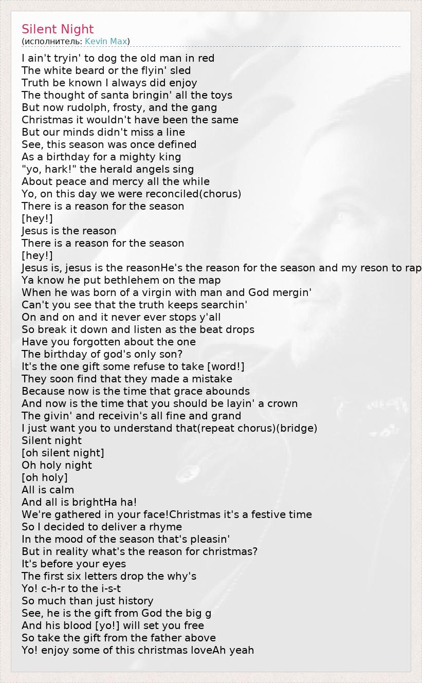 I ain't tryin' to dog the old man in red The white beard or the flyin' sled Truth be known I always did enjoy The thought of santa bringin' all the toys But now rudolph, frosty, and the gang Christmas it wouldn't have been the same But our minds didn't miss a line See, this season was once defined As a birthday for a mighty king "yo, hark!" the herald angels sing About peace and mercy all the while Yo, on this day we were reconciled(chorus) There is a reason for the season [hey!] Jesus is the reason There is a reason for the season [hey!] Jesus is, jesus is the reasonHe's the reason for the season and my reson to rap Ya know he put bethlehem on the map When he was born of a virgin with man and God mergin' Can't you see that the truth keeps searchin' On and on and it never ever stops y'all So break it down and listen as the beat drops Have you forgotten about the one The birthday of god's only son? It's the one gift some refuse to take [word!] They soon find that they made a mistake Because now is the time that grace abounds And now is the time that you should be layin' a crown The givin' and receivin's all fine and grand I just want you to understand that(repeat chorus)(bridge) Silent night [oh silent night] Oh holy night [oh holy] All is calm And all is brightHa ha! We're gathered in your face!Christmas it's a festive time So I decided to deliver a rhyme In the mood of the season that's pleasin' But in reality what's the reason for christmas? It's before your eyes The first six letters drop the why's Yo! c-h-r to the i-s-t So much than just history See, he is the gift from God the big g And his blood [yo!] will set you free So take the gift from the father above Yo! enjoy some of this christmas loveAh yeah