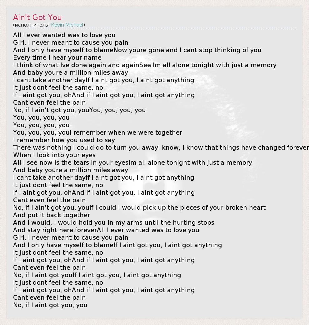 All I ever wanted was to love you Girl, I never meant to cause you pain And I only have myself to blameNow youre gone and I cant stop thinking of you Every time I hear your name I think of what Ive done again and againSee Im all alone tonight with just a memory And baby youre a million miles away I cant take another dayIf I aint got you, I aint got anything It just dont feel the same, no If I aint got you, ohAnd if I aint got you, I aint got anything Cant even feel the pain No, if I ain't got you, youYou, you, you, you You, you, you, you You, you, you, you You, you, you, youI remember when we were together I remember how you used to say There was nothing I could do to turn you awayI know, I know that things have changed forever When I look into your eyes All I see now is the tears in your eyesIm all alone tonight with just a memory And baby youre a million miles away I cant take another dayIf I aint got you, I aint got anything It just dont feel the same, no If I aint got you, ohAnd if I aint got you, I aint got anything Cant even feel the pain No, if I ain't got you, youIf I could I would pick up the pieces of your broken heart And put it back together And I would, I would hold you in my arms until the hurting stops And stay right here foreverAll I ever wanted was to love you Girl, I never meant to cause you pain And I only have myself to blameIf I aint got you, I aint got anything It just dont feel the same, no If I aint got you, ohAnd if I aint got you, I aint got anything Cant even feel the pain No, if I aint got youIf I aint got you, I aint got anything It just dont feel the same, no If I aint got you, ohAnd if I aint got you, I aint got anything Cant even feel the pain No, if I aint got you, you