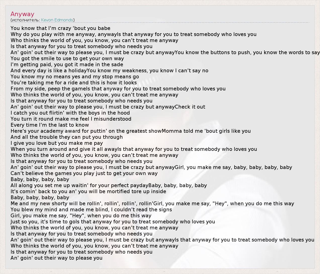 An' goin' out their way to please you, I must be crazy but anywayIs that anyway for you to treat somebody who loves you