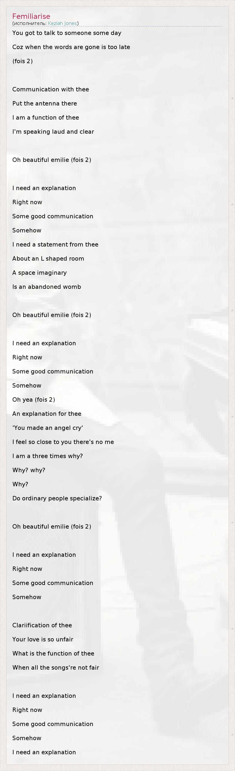 You got to talk to someone some day Coz when the words are gone is too late (fois 2) Communication with thee Put the antenna there I am a function of thee I'm speaking laud and clear Oh beautiful emilie (fois 2) I need an explanation Right now Some good communication Somehow I need a statement from thee About an L shaped room A space imaginary Is an abandoned womb Oh beautiful emilie (fois 2) I need an explanation Right now Some good communication Somehow Oh yea (fois 2) An explanation for thee 'You made an angel cry' I feel so close to you there's no me I am a three times why? Why? why? Why? Do ordinary people specialize? Oh beautiful emilie (fois 2) I need an explanation Right now Some good communication Somehow Clariification of thee Your love is so unfair What is the function of thee When all the songs're not fair I need an explanation Right now Some good communication Somehow I need an explanation