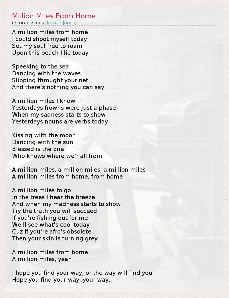 А как ты думаешь, о чем песня "Million Miles From Home" ?