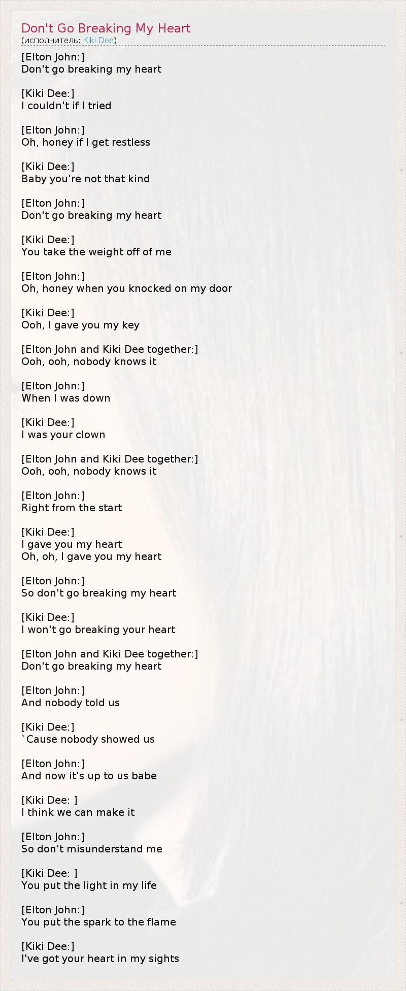[Elton John:] Don't go breaking my heart [Kiki Dee:] I couldn't if I tried [Elton John:] Oh, honey if I get restless [Kiki Dee:] Baby you're not that kind [Elton John:] Don't go breaking my heart [Kiki Dee:] You take the weight off of me [Elton John:] Oh, honey when you knocked on my door [Kiki Dee:] Ooh, I gave you my key [Elton John and Kiki Dee together:] Ooh, ooh, nobody knows it [Elton John:] When I was down [Kiki Dee:] I was your clown [Elton John and Kiki Dee together:] Ooh, ooh, nobody knows it [Elton John:] Right from the start [Kiki Dee:] I gave you my heart Oh, oh, I gave you my heart [Elton John:] So don't go breaking my heart [Kiki Dee:] I won't go breaking your heart [Elton John and Kiki Dee together:] Don't go breaking my heart [Elton John:] And nobody told us [Kiki Dee:] `Cause nobody showed us [Elton John:] And now it's up to us babe [Kiki Dee: ] I think we can make it [Elton John:] So don't misunderstand me [Kiki Dee: ] You put the light in my life [Elton John:] You put the spark to the flame [Kiki Dee:] I've got your heart in my sights