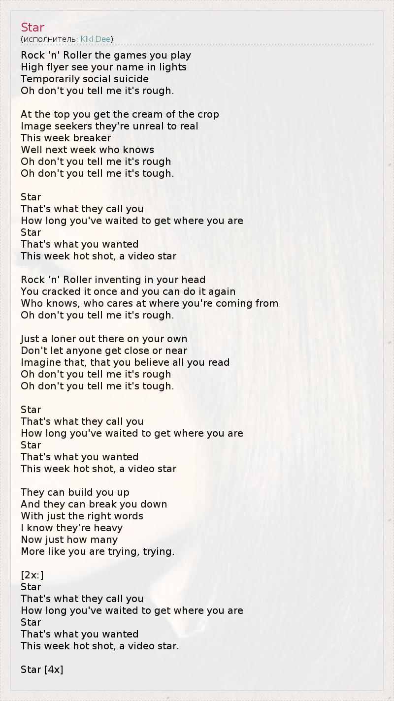 Это интересно:Ее карьера охватывает более 40 лет. Кики наиболее известна за свой дуэт с Элтоном Джоном (Elton John) 1976-го, 'Don't Go Breaking My Heart'. С этой песней она возглавила британский сингл-чарт и чарт 'Billboard Hot 100'. В 1993-м родился еще один дуэт Ди с Джоном с его альбома 'Duets', кавер-версия песни Коула Портера (Cole Porter) 'True Love'. Эта песня обосновалась на 2-м месте в британском чарте.Кики Ди – при... продолжение