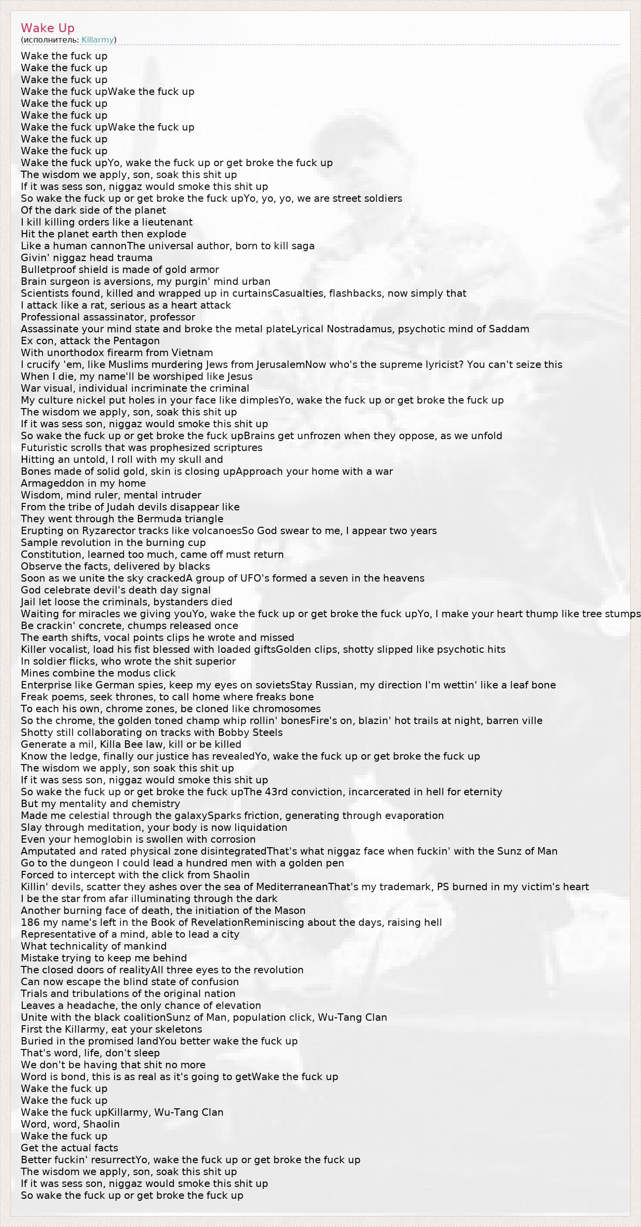 Wake the fuck up Wake the fuck up Wake the fuck up Wake the fuck upWake the fuck up Wake the fuck up Wake the fuck up Wake the fuck upWake the fuck up Wake the fuck up Wake the fuck up Wake the fuck upYo, wake the fuck up or get broke the fuck up The wisdom we apply, son, soak this shit up If it was sess son, niggaz would smoke this shit up So wake the fuck up or get broke the fuck upYo, yo, yo, we are street soldiers Of the dark side of the planet I kill killing orders like a lieutenant Hit the planet earth then explode Like a human cannonThe universal author, born to kill saga Givin' niggaz head trauma Bulletproof shield is made of gold armor Brain surgeon is aversions, my purgin' mind urban Scientists found, killed and wrapped up in curtainsCasualties, flashbacks, now simply that I attack like a rat, serious as a heart attack Professional assassinator, professor Assassinate your mind state and broke the metal plateLyrical Nostradamus, psychotic mind of Saddam Ex con, attack the Pentagon With unorthodox firearm from Vietnam I crucify 'em, like Muslims murdering Jews from JerusalemNow who's the supreme lyricist? You can't seize this When I die, my name'll be worshiped like Jesus War visual, individual incriminate the criminal My culture nickel put holes in your face like dimplesYo, wake the fuck up or get broke the fuck up The wisdom we apply, son, soak this shit up If it was sess son, niggaz would smoke this shit up So wake the fuck up or get broke the fuck upBrains get unfrozen when they oppose, as we unfold Futuristic scrolls that was prophesized scriptures Hitting an untold, I roll with my skull and Bones made of solid gold, skin is closing upApproach your home with a war Armageddon in my home Wisdom, mind ruler, mental intruder From the tribe of Judah devils disappear like They went through the Bermuda triangle Erupting on Ryzarector tracks like volcanoesSo God swear to me, I appear two years Sample revolution in the burning cup Constitution, learned too much, came off must return Observe the facts, delivered by blacks Soon as we unite the sky crackedA group of UFO's formed a seven in the heavens God celebrate devil's death day signal Jail let loose the criminals, bystanders died Waiting for miracles we giving youYo, wake the fuck up or get broke the fuck upYo, I make your heart thump like tree stumps Be crackin' concrete, chumps released once The earth shifts, vocal points clips he wrote and missed Killer vocalist, load his fist blessed with loaded giftsGolden clips, shotty slipped like psychotic hits In soldier flicks, who wrote the shit superior Mines combine the modus click Enterprise like German spies, keep my eyes on sovietsStay Russian, my direction I'm wettin' like a leaf bone Freak poems, seek thrones, to call home where freaks bone To each his own, chrome zones, be cloned like chromosomes So the chrome, the golden toned champ whip rollin' bonesFire's on, blazin' hot trails at night, barren ville Shotty still collaborating on tracks with Bobby Steels Generate a mil, Killa Bee law, kill or be killed Know the ledge, finally our justice has revealedYo, wake the fuck up or get broke the fuck up The wisdom we apply, son soak this shit up If it was sess son, niggaz would smoke this shit up So wake the fuck up or get broke the fuck upThe 43rd conviction, incarcerated in hell for eternity But my mentality and chemistry Made me celestial through the galaxySparks friction, generating through evaporation Slay through meditation, your body is now liquidation Even your hemoglobin is swollen with corrosion Amputated and rated physical zone disintegratedThat's what niggaz face when fuckin' with the Sunz of Man Go to the dungeon I could lead a hundred men with a golden pen Forced to intercept with the click from Shaolin Killin' devils, scatter they ashes over the sea of MediterraneanThat's my trademark, PS burned in my victim's heart I be the star from afar illuminating through the dark Another burning face of death, the initiation of the Mason 186 my name's left in the Book of RevelationReminiscing about the days, raising hell Representative of a mind, able to lead a city What technicality of mankind Mistake trying to keep me behind The closed doors of realityAll three eyes to the revolution Can now escape the blind state of confusion Trials and tribulations of the original nation Leaves a headache, the only chance of elevation Unite with the black coalitionSunz of Man, population click, Wu-Tang Clan First the Killarmy, eat your skeletons Buried in the promised landYou better wake the fuck up That's word, life, don't sleep We don't be having that shit no more Word is bond, this is as real as it's going to getWake the fuck up Wake the fuck up Wake the fuck up Wake the fuck upKillarmy, Wu-Tang Clan Word, word, Shaolin Wake the fuck up Get the actual facts Better fuckin' resurrectYo, wake the fuck up or get broke the fuck up The wisdom we apply, son, soak this shit up If it was sess son, niggaz would smoke this shit up So wake the fuck up or get broke the fuck up
