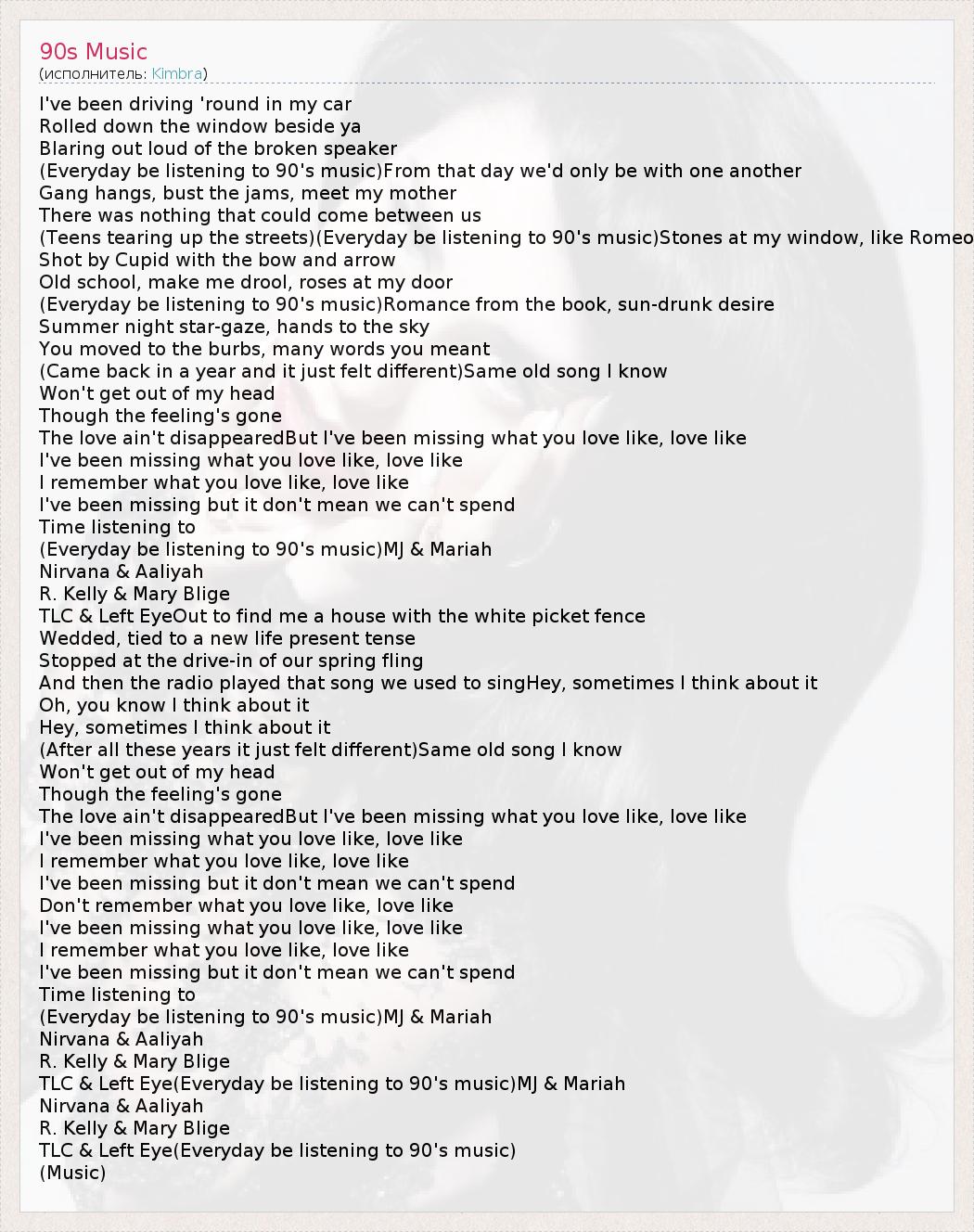 I've been driving 'round in my car Rolled down the window beside ya Blaring out loud of the broken speaker (Everyday be listening to 90's music)From that day we'd only be with one another Gang hangs, bust the jams, meet my mother There was nothing that could come between us (Teens tearing up the streets)(Everyday be listening to 90's music)Stones at my window, like Romeo Shot by Cupid with the bow and arrow Old school, make me drool, roses at my door (Everyday be listening to 90's music)Romance from the book, sun-drunk desire Summer night star-gaze, hands to the sky You moved to the burbs, many words you meant (Came back in a year and it just felt different)Same old song I know Won't get out of my head Though the feeling's gone The love ain't disappearedBut I've been missing what you love like, love like I've been missing what you love like, love like I remember what you love like, love like I've been missing but it don't mean we can't spend Time listening to (Everyday be listening to 90's music)MJ & Mariah Nirvana & Aaliyah R. Kelly & Mary Blige TLC & Left EyeOut to find me a house with the white picket fence Wedded, tied to a new life present tense Stopped at the drive-in of our spring fling And then the radio played that song we used to singHey, sometimes I think about it Oh, you know I think about it Hey, sometimes I think about it (After all these years it just felt different)Same old song I know Won't get out of my head Though the feeling's gone The love ain't disappearedBut I've been missing what you love like, love like I've been missing what you love like, love like I remember what you love like, love like I've been missing but it don't mean we can't spend Don't remember what you love like, love like I've been missing what you love like, love like I remember what you love like, love like I've been missing but it don't mean we can't spend Time listening to (Everyday be listening to 90's music)MJ & Mariah Nirvana & Aaliyah R. Kelly & Mary Blige TLC & Left Eye(Everyday be listening to 90's music)MJ & Mariah Nirvana & Aaliyah R. Kelly & Mary Blige TLC & Left Eye(Everyday be listening to 90's music) (Music)