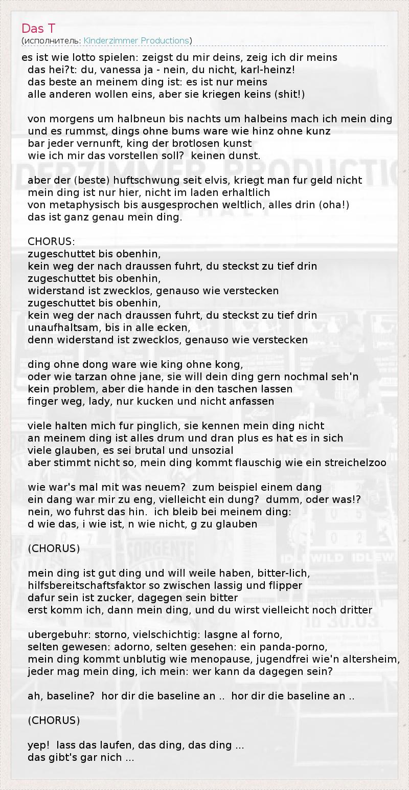 es ist wie lotto spielen: zeigst du mir deins, zeig ich dir meins das hei?t: du, vanessa ja - nein, du nicht, karl-heinz! das beste an meinem ding ist: es ist nur meins alle anderen wollen eins, aber sie kriegen keins (shit!) von morgens um halbneun bis nachts um halbeins mach ich mein ding und es rummst, dings ohne bums ware wie hinz ohne kunz bar jeder vernunft, king der brotlosen kunst wie ich mir das vorstellen soll? keinen dunst. aber der (beste) huftschwung seit elvis, kriegt man fur geld nicht mein ding ist nur hier, nicht im laden erhaltlich von metaphysisch bis ausgesprochen weltlich, alles drin (oha!) das ist ganz genau mein ding. CHORUS: zugeschuttet bis obenhin, kein weg der nach draussen fuhrt, du steckst zu tief drin zugeschuttet bis obenhin, widerstand ist zwecklos, genauso wie verstecken zugeschuttet bis obenhin, kein weg der nach draussen fuhrt, du steckst zu tief drin unaufhaltsam, bis in alle ecken, denn widerstand ist zwecklos, genauso wie verstecken ding ohne dong ware wie king ohne kong, oder wie tarzan ohne jane, sie will dein ding gern nochmal seh'n kein problem, aber die hande in den taschen lassen finger weg, lady, nur kucken und nicht anfassen viele halten mich fur pinglich, sie kennen mein ding nicht an meinem ding ist alles drum und dran plus es hat es in sich viele glauben, es sei brutal und unsozial aber stimmt nicht so, mein ding kommt flauschig wie ein streichelzoo wie war's mal mit was neuem? zum beispiel einem dang ein dang war mir zu eng, vielleicht ein dung? dumm, oder was!? nein, wo fuhrst das hin. ich bleib bei meinem ding: d wie das, i wie ist, n wie nicht, g zu glauben (CHORUS) mein ding ist gut ding und will weile haben, bitter-lich, hilfsbereitschaftsfaktor so zwischen lassig und flipper dafur sein ist zucker, dagegen sein bitter erst komm ich, dann mein ding, und du wirst vielleicht noch dritter ubergebuhr: storno, vielschichtig: lasgne al forno, selten gewesen: adorno, selten gesehen: ein panda-porno, mein ding kommt unblutig wie menopause, jugendfrei wie'n altersheim, jeder mag mein ding, ich mein: wer kann da dagegen sein? ah, baseline? hor dir die baseline an .. hor dir die baseline an .. (CHORUS) yep! lass das laufen, das ding, das ding ... das gibt's gar nich ...