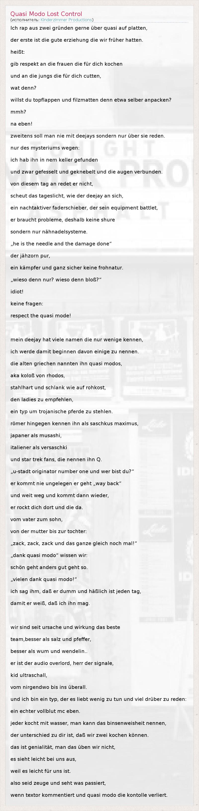 А как ты думаешь, о чем песня "Quasi Modo Lost Control" ?