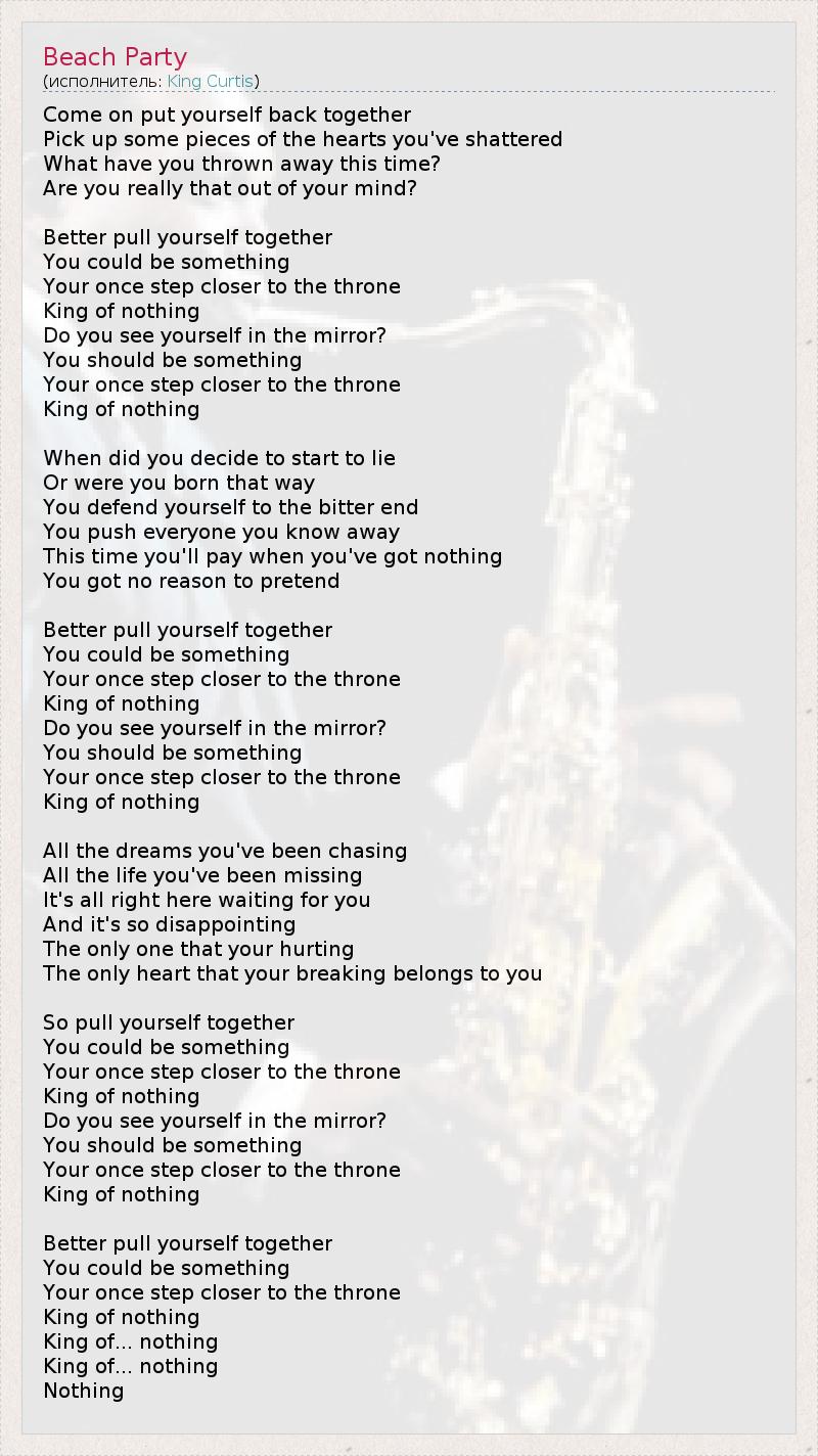 Come on put yourself back together Pick up some pieces of the hearts you've shattered What have you thrown away this time? Are you really that out of your mind? Better pull yourself together You could be something Your once step closer to the throne King of nothing Do you see yourself in the mirror? You should be something Your once step closer to the throne King of nothing When did you decide to start to lie Or were you born that way You defend yourself to the bitter end You push everyone you know away This time you'll pay when you've got nothing You got no reason to pretend Better pull yourself together You could be something Your once step closer to the throne King of nothing Do you see yourself in the mirror? You should be something Your once step closer to the throne King of nothing All the dreams you've been chasing All the life you've been missing It's all right here waiting for you And it's so disappointing The only one that your hurting The only heart that your breaking belongs to you So pull yourself together You could be something Your once step closer to the throne King of nothing Do you see yourself in the mirror? You should be something Your once step closer to the throne King of nothing Better pull yourself together You could be something Your once step closer to the throne King of nothing King of... nothing King of... nothing Nothing