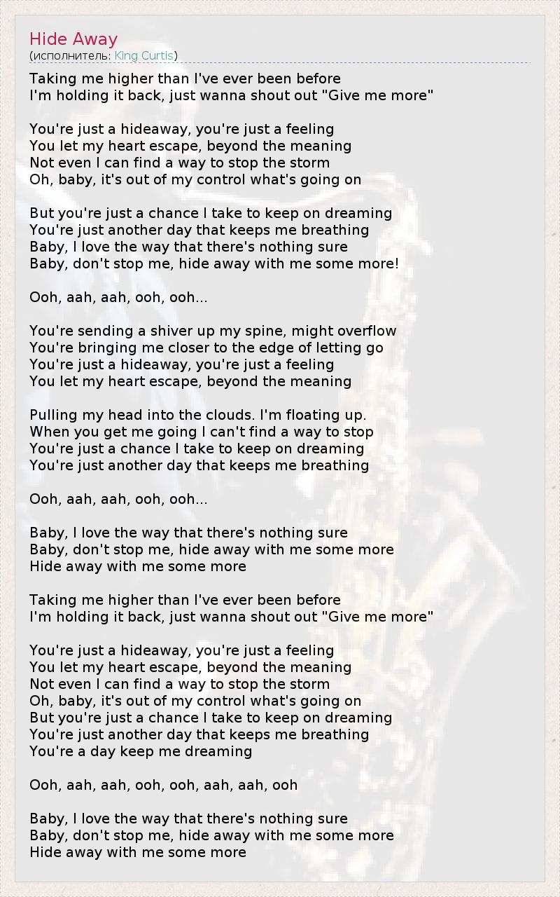 Taking me higher than I've ever been before I'm holding it back, just wanna shout out "Give me more" You're just a hideaway, you're just a feeling You let my heart escape, beyond the meaning Not even I can find a way to stop the storm Oh, baby, it's out of my control what's going on But you're just a chance I take to keep on dreaming You're just another day that keeps me breathing Baby, I love the way that there's nothing sure Baby, don't stop me, hide away with me some more! Ooh, aah, aah, ooh, ooh... You're sending a shiver up my spine, might overflow You're bringing me closer to the edge of letting go You're just a hideaway, you're just a feeling You let my heart escape, beyond the meaning Pulling my head into the clouds. I'm floating up. When you get me going I can't find a way to stop You're just a chance I take to keep on dreaming You're just another day that keeps me breathing Ooh, aah, aah, ooh, ooh... Baby, I love the way that there's nothing sure Baby, don't stop me, hide away with me some more Hide away with me some more Taking me higher than I've ever been before I'm holding it back, just wanna shout out "Give me more" You're just a hideaway, you're just a feeling You let my heart escape, beyond the meaning Not even I can find a way to stop the storm Oh, baby, it's out of my control what's going on But you're just a chance I take to keep on dreaming You're just another day that keeps me breathing You're a day keep me dreaming Ooh, aah, aah, ooh, ooh, aah, aah, ooh Baby, I love the way that there's nothing sure Baby, don't stop me, hide away with me some more Hide away with me some more