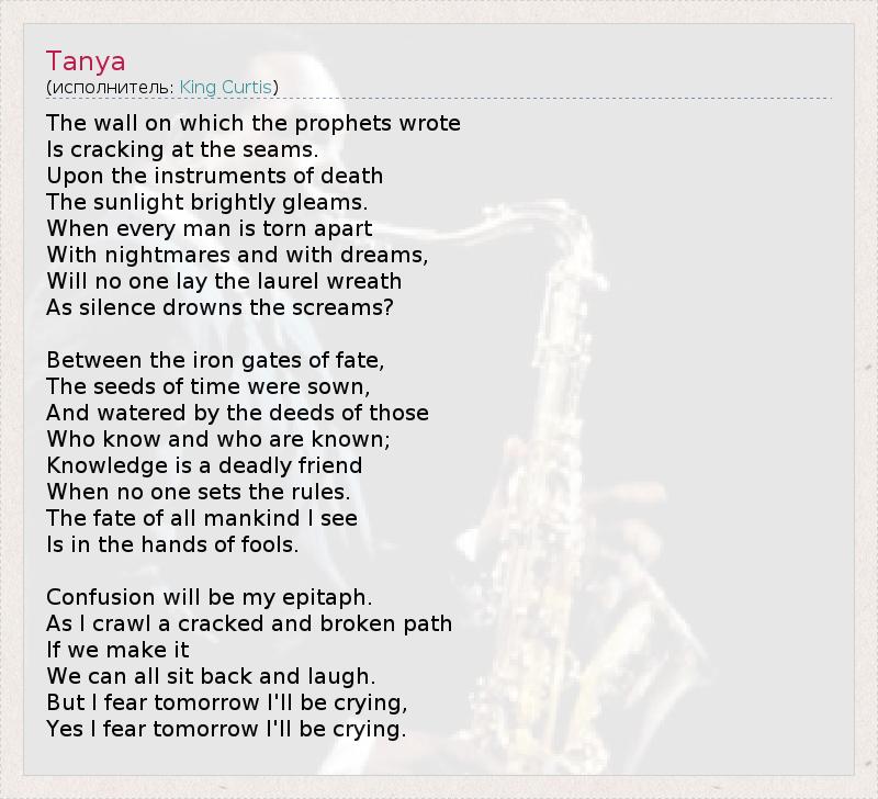 Стена, на которой писали пророки, Теперь трещит по швам. На орудиях смерти Ярко поблескивает солнечный свет. Если каждого человека разрывают на части Кошмары и сны, Неужели никто не положит лавровый венок, Когда тишина заглушит эти крики? Между железными воротами судьбы Были посеяны семена времени, И поливались они делами тех, Кто знает и кто известен; Знание – это коварный друг, Когда никто не устанавливает правил. Я вижу, что судьба всего человечества Находится в руках у дураков. Смятение станет моей эпитафией. Пока я ползу по потрескавшейся и разбитой тропе, Если у нас все получится, Мы все сможем сидеть сложа руки и смеяться. Но я боюсь, что завтра я буду плакать, Да, я боюсь, что завтра я буду плакать.