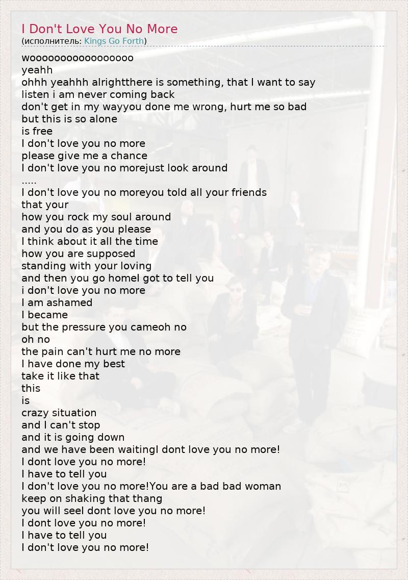 wooooooooooooooooo yeahh ohhh yeahhh alrightthere is something, that I want to say listen i am never coming back don't get in my wayyou done me wrong, hurt me so bad but this is so alone is free I don't love you no more please give me a chance I don't love you no morejust look around ..... I don't love you no moreyou told all your friends that your how you rock my soul around and you do as you please I think about it all the time how you are supposed standing with your loving and then you go homeI got to tell you i don't love you no more I am ashamed I became but the pressure you cameoh no oh no the pain can't hurt me no more I have done my best take it like that this is crazy situation and I can't stop and it is going down and we have been waitingI dont love you no more! I dont love you no more! I have to tell you I don't love you no more!You are a bad bad woman keep on shaking that thang you will seeI dont love you no more! I dont love you no more! I have to tell you I don't love you no more!