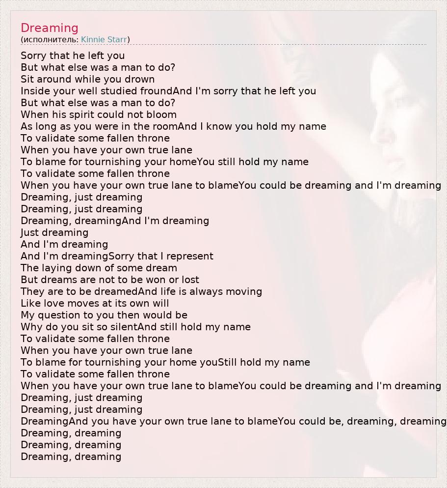Sorry that he left you But what else was a man to do? Sit around while you drown Inside your well studied froundAnd I'm sorry that he left you But what else was a man to do? When his spirit could not bloom As long as you were in the roomAnd I know you hold my name To validate some fallen throne When you have your own true lane To blame for tournishing your homeYou still hold my name To validate some fallen throne When you have your own true lane to blameYou could be dreaming and I'm dreaming Dreaming, just dreaming Dreaming, just dreaming Dreaming, dreamingAnd I'm dreaming Just dreaming And I'm dreaming And I'm dreamingSorry that I represent The laying down of some dream But dreams are not to be won or lost They are to be dreamedAnd life is always moving Like love moves at its own will My question to you then would be Why do you sit so silentAnd still hold my name To validate some fallen throne When you have your own true lane To blame for tournishing your home youStill hold my name To validate some fallen throne When you have your own true lane to blameYou could be dreaming and I'm dreaming Dreaming, just dreaming Dreaming, just dreaming DreamingAnd you have your own true lane to blameYou could be, dreaming, dreaming Dreaming, dreaming Dreaming, dreaming Dreaming, dreaming