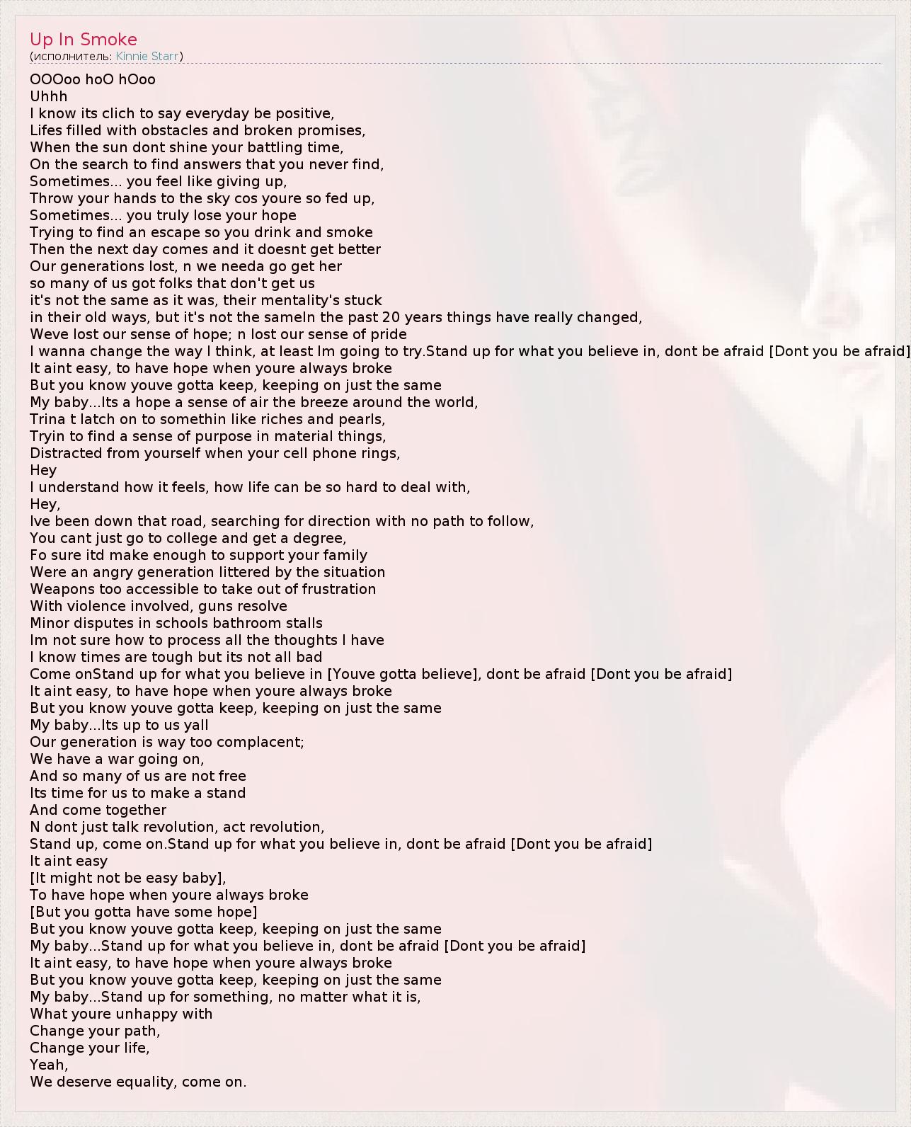 Come onStand up for what you believe in [Youve gotta believe], dont be afraid [Dont you be afraid]