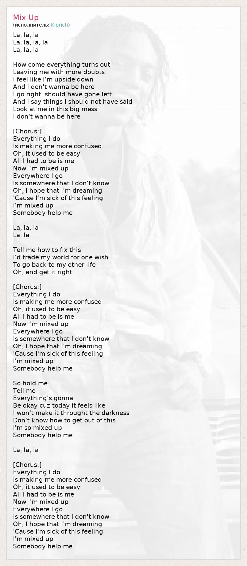 La, la, la La, la, la, la La, la, la How come everything turns out Leaving me with more doubts I feel like I'm upside down And I don't wanna be here I go right, should have gone left And I say things I should not have said Look at me in this big mess I don't wanna be here [Chorus:] Everything I do Is making me more confused Oh, it used to be easy All I had to be is me Now I'm mixed up Everywhere I go Is somewhere that I don't know Oh, I hope that I'm dreaming 'Cause I'm sick of this feeling I'm mixed up Somebody help me La, la, la La, la Tell me how to fix this I'd trade my world for one wish To go back to my other life Oh, and get it right [Chorus:] Everything I do Is making me more confused Oh, it used to be easy All I had to be is me Now I'm mixed up Everywhere I go Is somewhere that I don't know Oh, I hope that I'm dreaming 'Cause I'm sick of this feeling I'm mixed up Somebody help me So hold me Tell me Everything's gonna Be okay cuz today it feels like I won't make it throught the darkness Don't know how to get out of this I'm so mixed up Somebody help me La, la, la [Chorus:] Everything I do Is making me more confused Oh, it used to be easy All I had to be is me Now I'm mixed up Everywhere I go Is somewhere that I don't know Oh, I hope that I'm dreaming 'Cause I'm sick of this feeling I'm mixed up Somebody help me