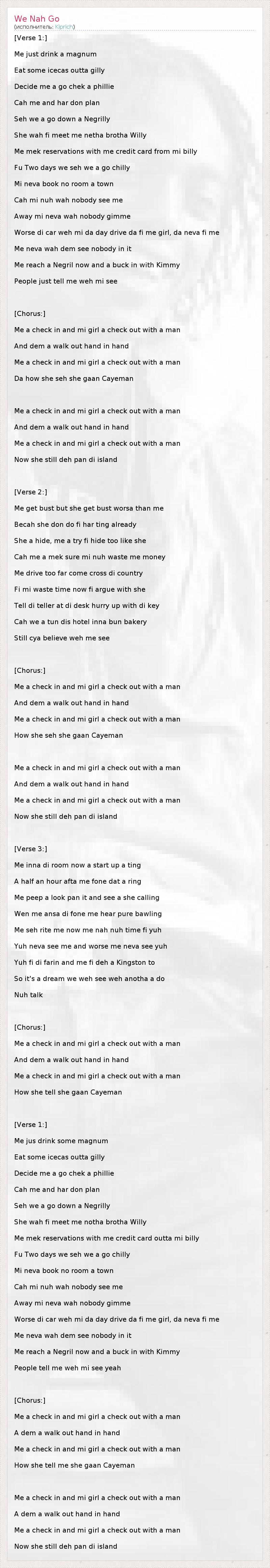 [Verse 1:] Me just drink a magnum Eat some icecas outta gilly Decide me a go chek a phillie Cah me and har don plan Seh we a go down a Negrilly She wah fi meet me netha brotha Willy Me mek reservations with me credit card from mi billy Fu Two days we seh we a go chilly Mi neva book no room a town Cah mi nuh wah nobody see me Away mi neva wah nobody gimme Worse di car weh mi da day drive da fi me girl, da neva fi me Me neva wah dem see nobody in it Me reach a Negril now and a buck in with Kimmy People just tell me weh mi see [Chorus:] Me a check in and mi girl a check out with a man And dem a walk out hand in hand Me a check in and mi girl a check out with a man Da how she seh she gaan Cayeman Me a check in and mi girl a check out with a man And dem a walk out hand in hand Me a check in and mi girl a check out with a man Now she still deh pan di island [Verse 2:] Me get bust but she get bust worsa than me Becah she don do fi har ting already She a hide, me a try fi hide too like she Cah me a mek sure mi nuh waste me money Me drive too far come cross di country Fi mi waste time now fi argue with she Tell di teller at di desk hurry up with di key Cah we a tun dis hotel inna bun bakery Still cya believe weh me see [Chorus:] Me a check in and mi girl a check out with a man And dem a walk out hand in hand Me a check in and mi girl a check out with a man How she seh she gaan Cayeman Me a check in and mi girl a check out with a man And dem a walk out hand in hand Me a check in and mi girl a check out with a man Now she still deh pan di island [Verse 3:] Me inna di room now a start up a ting A half an hour afta me fone dat a ring Me peep a look pan it and see a she calling Wen me ansa di fone me hear pure bawling Me seh rite me now me nah nuh time fi yuh Yuh neva see me and worse me neva see yuh Yuh fi di farin and me fi deh a Kingston to So it's a dream we weh see weh anotha a do Nuh talk [Chorus:] Me a check in and mi girl a check out with a man And dem a walk out hand in hand Me a check in and mi girl a check out with a man How she tell she gaan Cayeman [Verse 1:] Me jus drink some magnum Eat some icecas outta gilly Decide me a go chek a phillie Cah me and har don plan Seh we a go down a Negrilly She wah fi meet me notha brotha Willy Me mek reservations with me credit card outta mi billy Fu Two days we seh we a go chilly Mi neva book no room a town Cah mi nuh wah nobody see me Away mi neva wah nobody gimme Worse di car weh mi da day drive da fi me girl, da neva fi me Me neva wah dem see nobody in it Me reach a Negril now and a buck in with Kimmy People tell me weh mi see yeah [Chorus:] Me a check in and mi girl a check out with a man A dem a walk out hand in hand Me a check in and mi girl a check out with a man How she tell me she gaan Cayeman Me a check in and mi girl a check out with a man A dem a walk out hand in hand Me a check in and mi girl a check out with a man Now she still deh pan di island